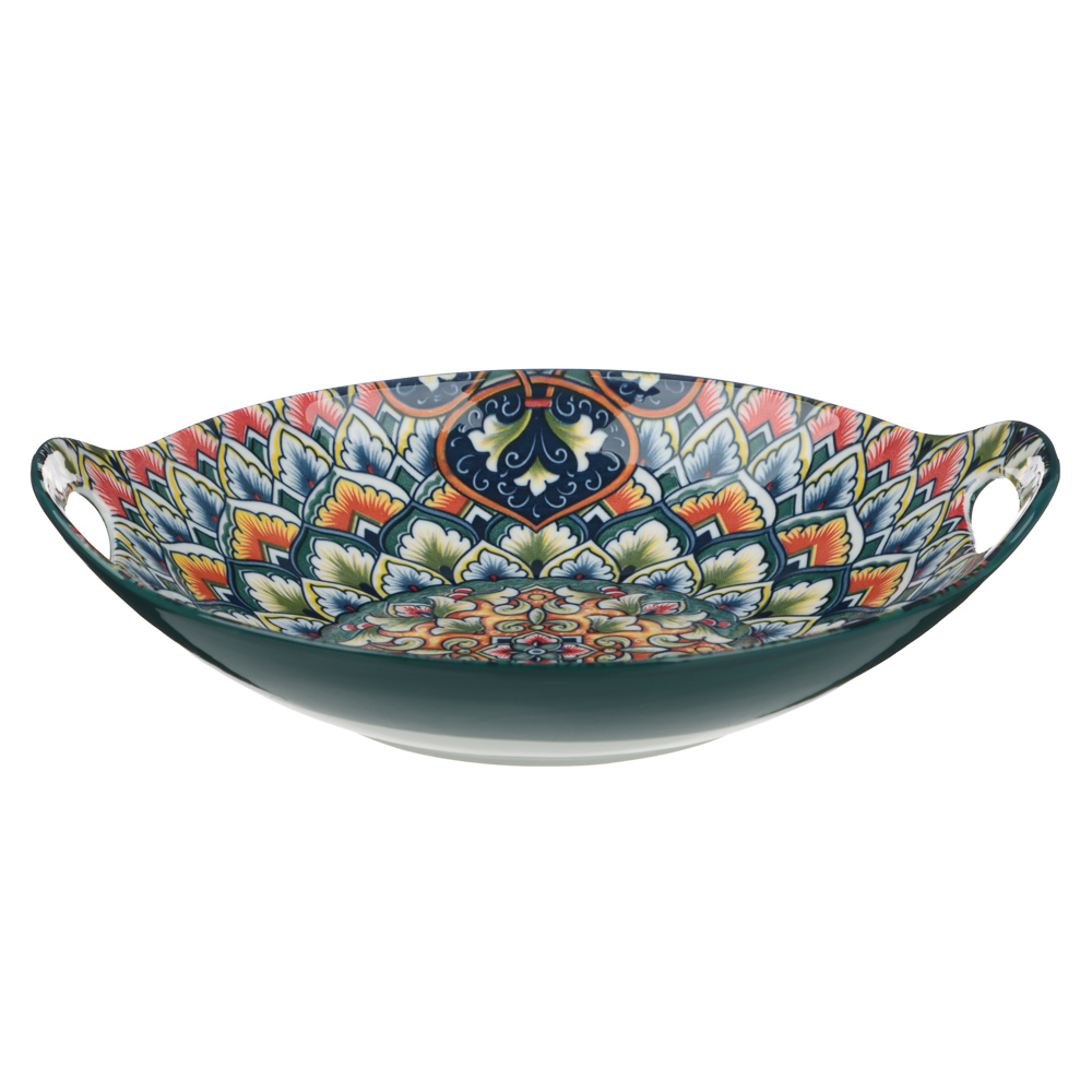 Блюдо с ручками 22х20х5 см, тм MILLIMI «Ориентал» из керамики – это эстетичная посуда, которая привнесет философию Востока в сервировку праздничного стола. Блюдо украшено самобытным орнаментом в ярких красках, гармонично сочетается с посудой в аналогичном стиле. Идеально подходит для подачи фруктов, орехов, восточных сладостей, а также плова на общий стол. Высококачественная керамика со стойкой глянцевой глазурью легко моется, устойчива к образованию царапин и сколов, не выцветает, сохраняя первоначальный вид в течение всего срока эксплуатации. Удобные боковые ручки позволяют с комфортом перемещать блюдо.