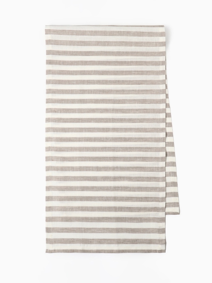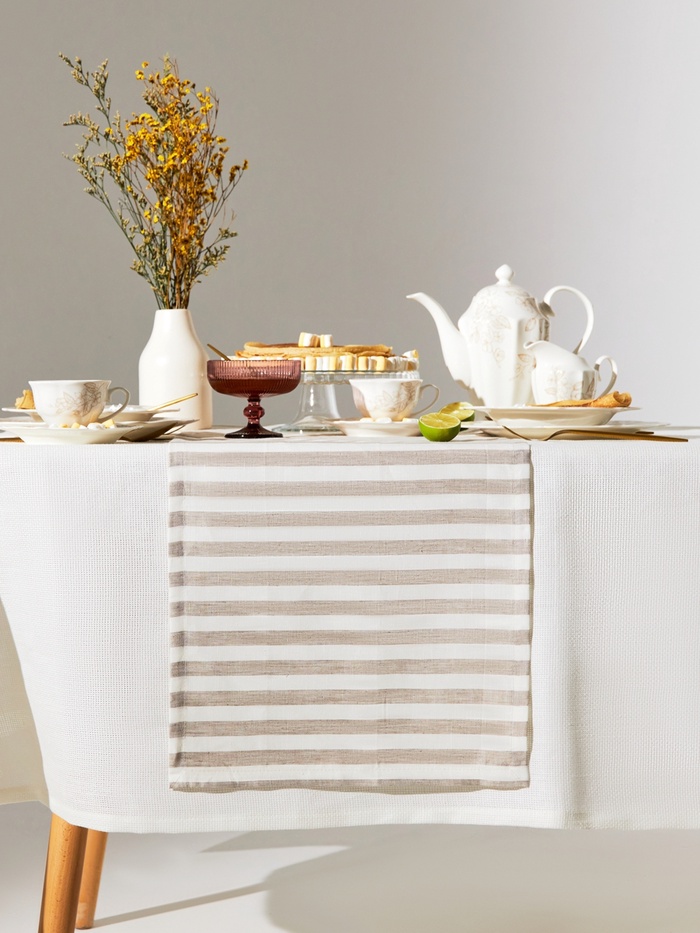 - Классическая полоска в нейтральной гамме сочетается с посудой любого цвета и стиля.