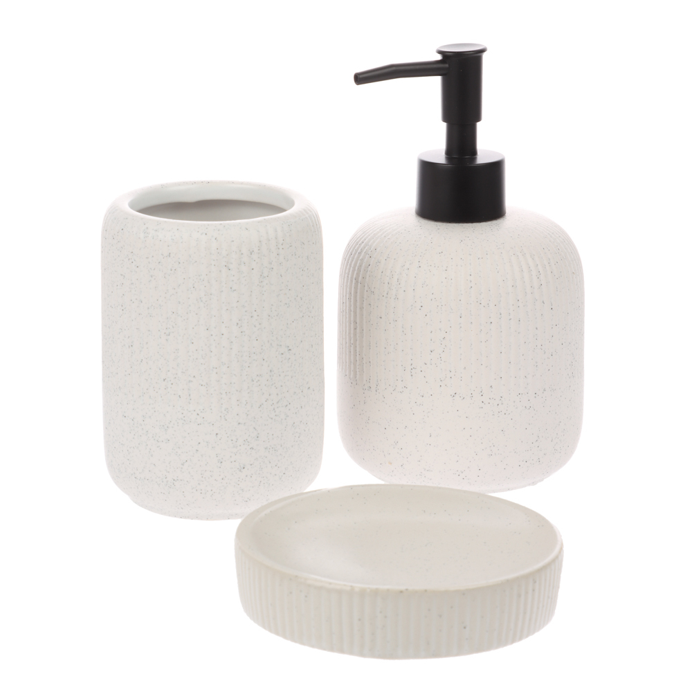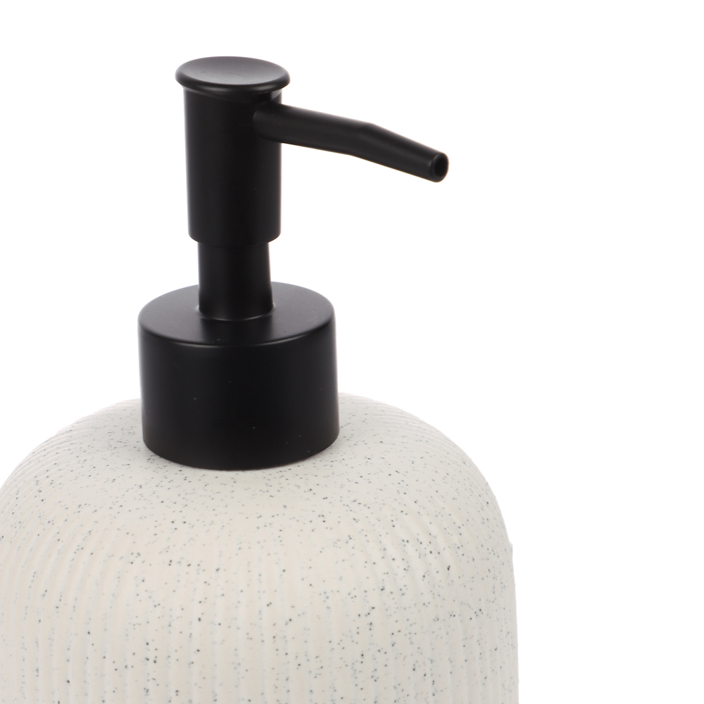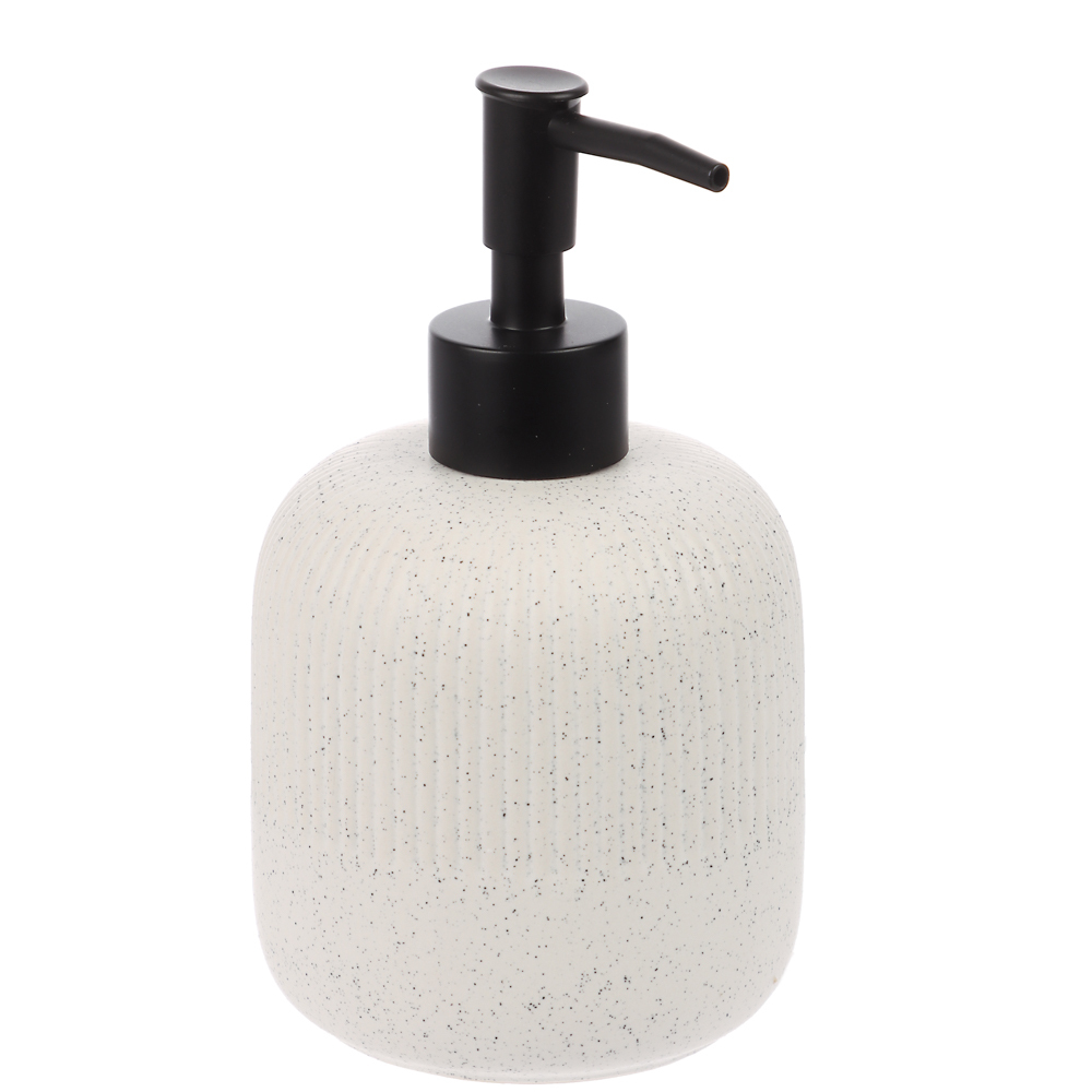 Изысканный дозатор для жидкого мыла NOBLE воплощает в себе утончённую простоту и элегантность современного дизайна. Выполненный из благородной керамики в тёплом бежевом оттенке, он украшен оригинальным декором в виде мелких точек-крошек, создающих неповторимый текстурный рисунок на поверхности. Объём в 300 миллилитров обеспечивает длительное использование без частой заправки, что делает дозатор особенно практичным в повседневном применении. Чёрная помпа, выполненная в строгом стиле, гармонично дополняет общий дизайн изделия, придавая ему современный и стильный вид. Керамический корпус не только обеспечивает долговечность и устойчивость к повреждениям, но и создаёт приятные тактильные ощущения при использовании.