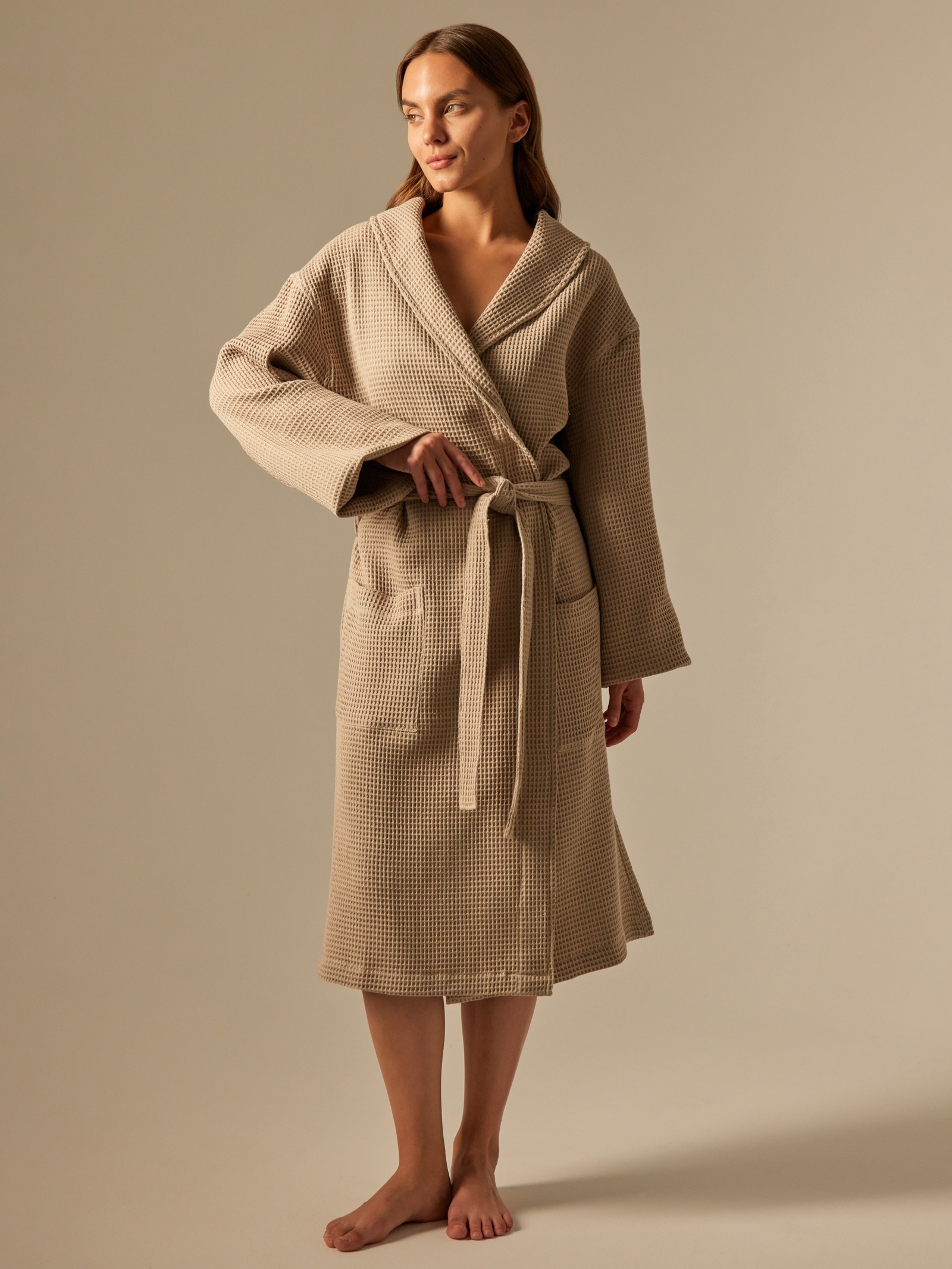 Этот женский вафельный халат — воплощение домашнего уюта и простой элегантности. Модель прямого кроя с втачными длинными рукавами и уютной шалькой создаёт ощущение мягкого объятия после душа или в спокойный выходной день. Он станет вашим любимым предметом гардероба для отдыха в любое время года.