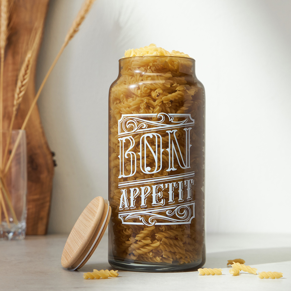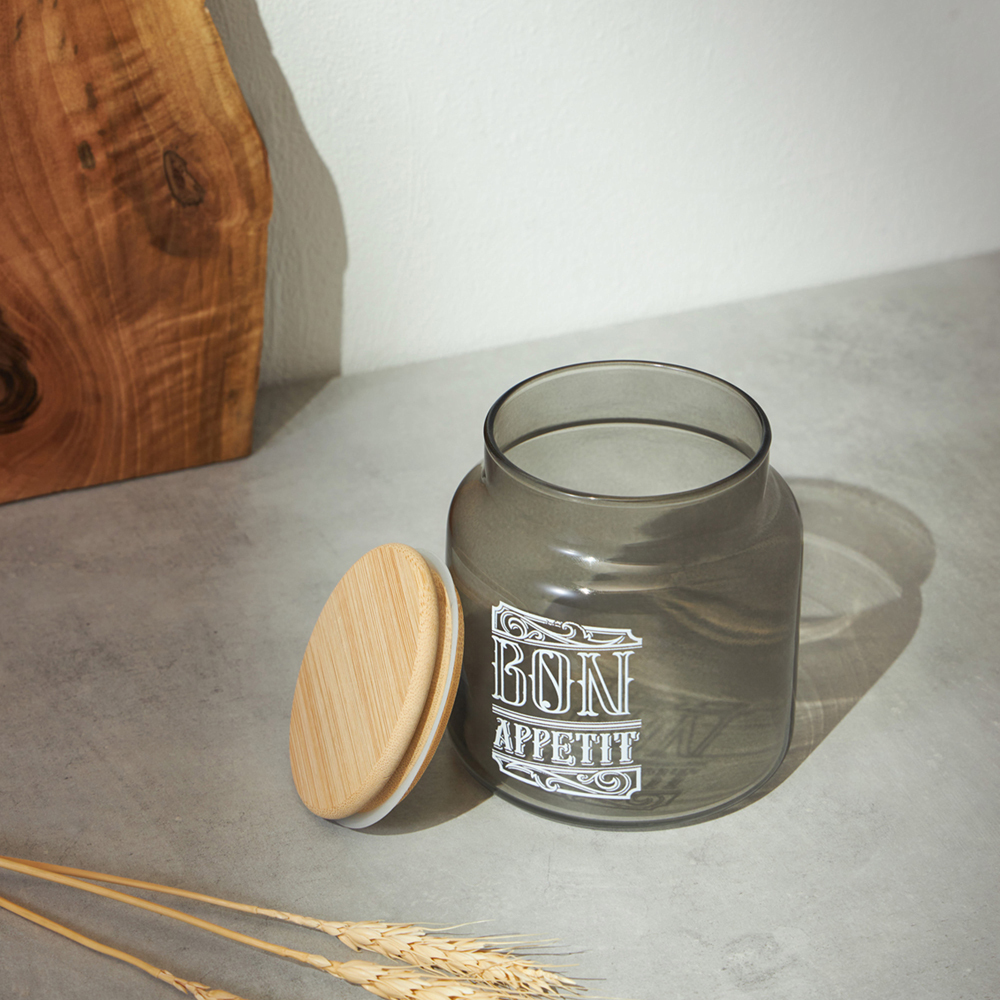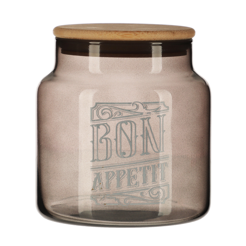 Набор стеклянных банок для сыпучих продуктов с деревянной крышкой HEREVIN «Бон Аппетит» объемом 635 мл, 890мл, 1400мл – это стильные емкости для хранения орехов, сухофруктов, чая, кофе и круп. Выполнена из прозрачного затемненного стекла с декоративным принтом. Впишется в любой интерьерный стиль, будет органично смотреться на полке кухонного шкафа. Стекло не искажает вкус содержимого, способствует долгому хранению, препятствуя слеживанию и комкованию продуктов. Плотная крышка не пропускает внутрь воздух, посторонние запахи и влагу.