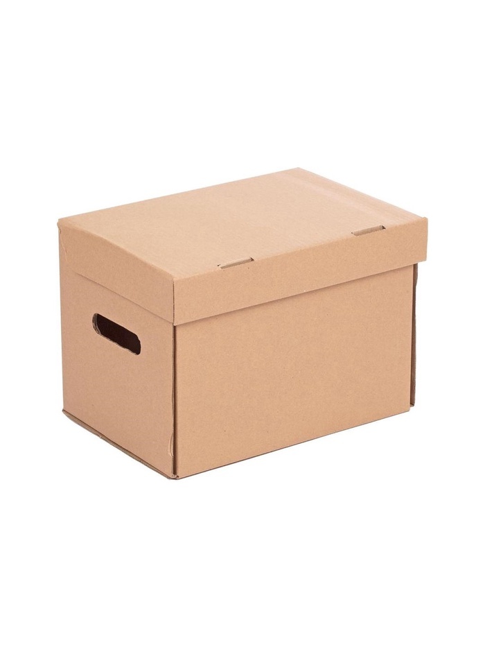 Он сделан из высококачественного бурого гофрокартона и способен выдерживать вес до 15–18 килограммов. У короба есть откидная крышка и отверстия по бокам для удобной переноски. Размер — 325×235×325 мм. Поставляется в разобранном виде и легко собирается без скотча и ножниц.