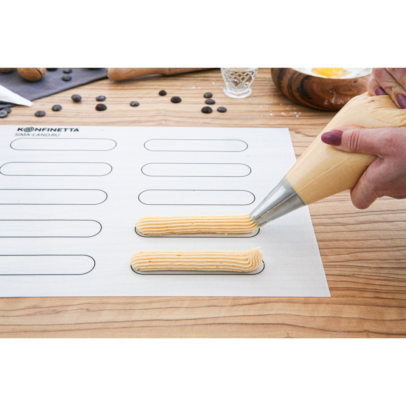 Армированный кондитерский коврик KONFINETTA изготовлен из пищевого силикона и усилен изнутри частицами стекловолокна. Идеален для приготовления эклеров. Он прослужит дольше обычного коврика, т. к. выдерживает высокую и низкую температуру.
