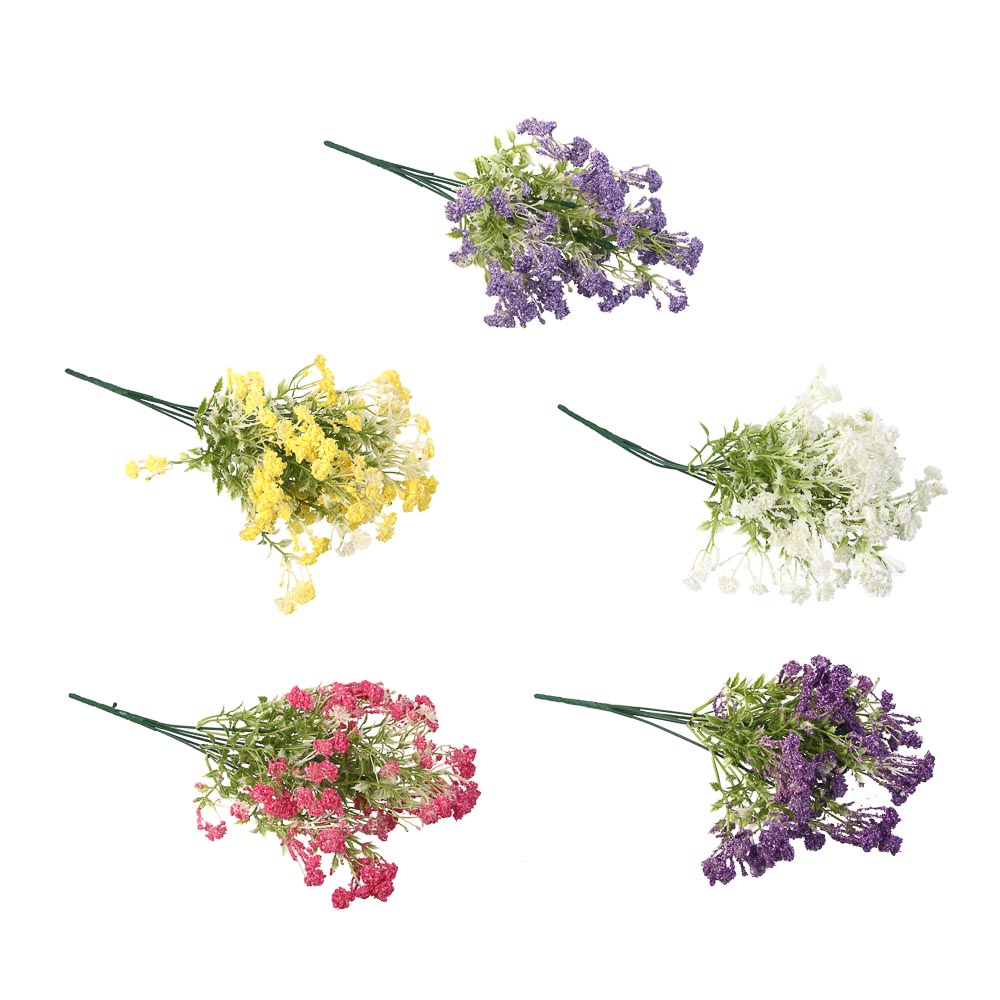 Изысканный букет искусственных цветов LADECOR станет настоящим украшением вашего интерьера. Нежная композиция из пяти изящных веточек, достигающих в высоту 33-35 сантиметров, создаст атмосферу свежести и уюта в любом помещении. Благодаря компактным размерам букет прекрасно впишется как в небольшой интерьер, так и станет ярким акцентом в просторном помещении. Гибкая конструкция на проволочном каркасе позволяет легко формировать желаемую композицию, подстраивая её под ваш вкус и стиль оформления. Высококачественный пластик обеспечивает реалистичный внешний вид каждого цветочка и листочка, а также долговечность изделия. Букет не требует полива, не выцветает на солнце и сохраняет свою привлекательность на протяжении долгого времени.