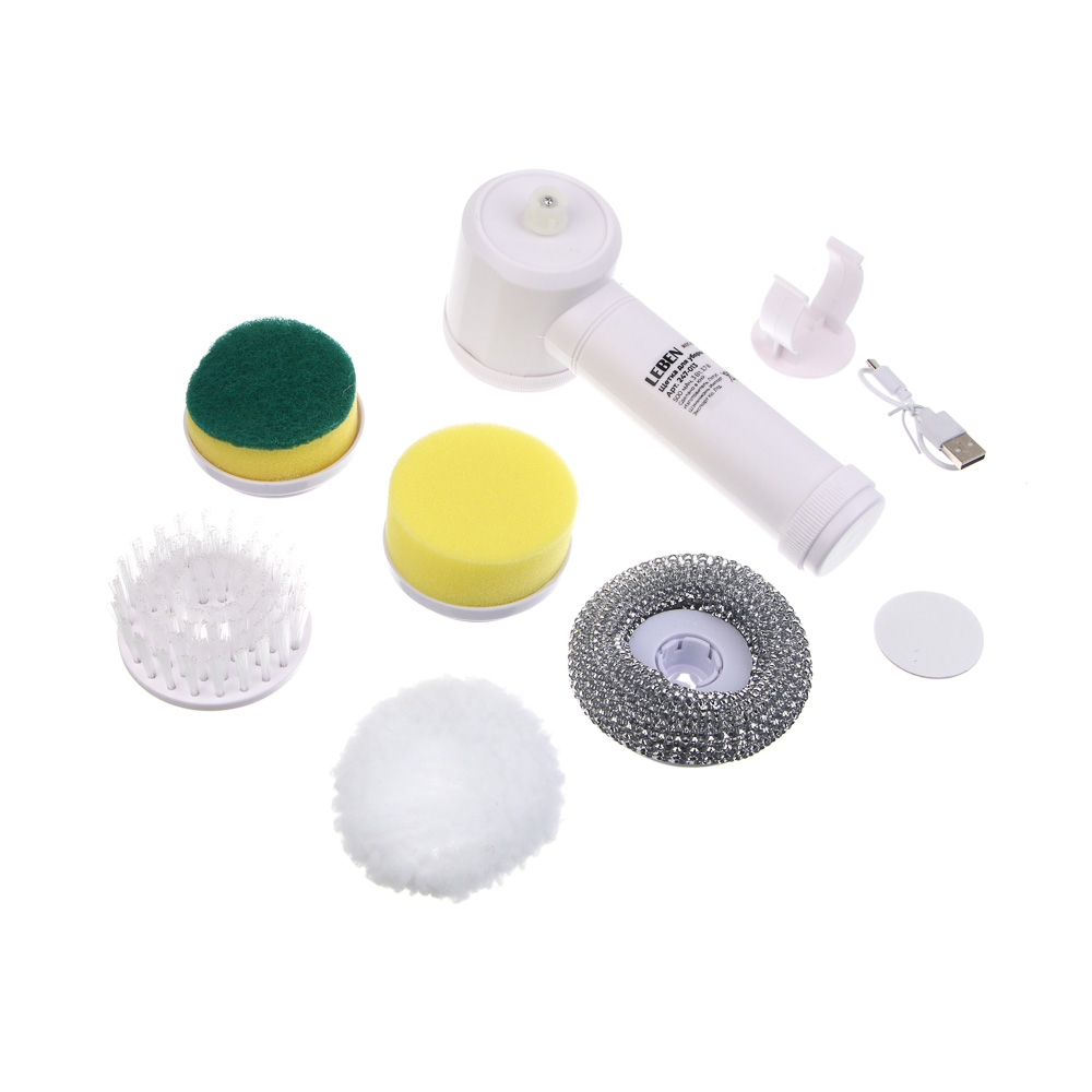 Электрическая щетка для уборки LEBEN, 5 насадок, мощность 500 мАч, цвет белый – это инновационное решение для быстрой и эффективной уборки. Легкий компактный корпус с удобной ручкой комфортно ложится в руку, не вызывая усталости даже после длительной уборки. Предусмотрено 5 насадок: щетка для чистки ковриков, кафеля и сильно загрязненных поверхностей, металлическая губка для удаления нагара с посуды и техники, губка с абразивным покрытием, мягкая губка и пушистая насадка с мягким ворсом для очищения гладких поверхностей до зеркального блеска без разводов. Электрическая щетка в разы повышает эффективность уборки и может использоваться на кухне, в ванной комнате и любых других помещениях. Насадки легко переставляются и моются. Работает до 120 минут без подзарядки. Кабель для зарядки входит в комплект.