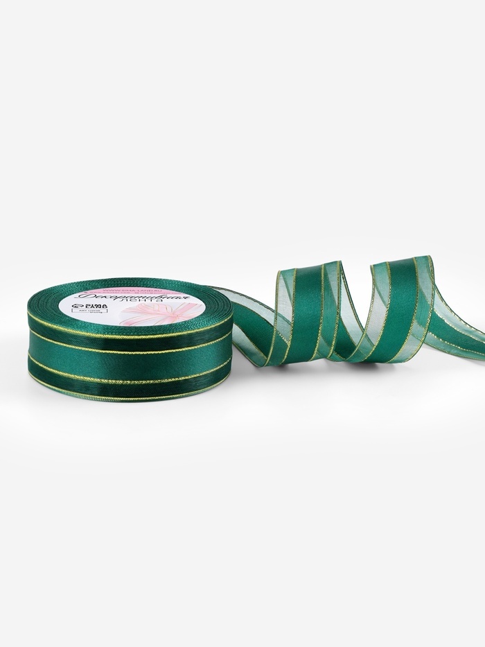 Лента декоративная, капроновая/атласная, с люрексом, 25 мм, 18±1 м, цвет изумрудный