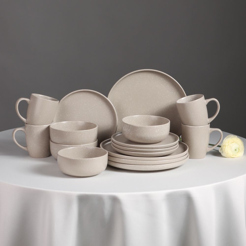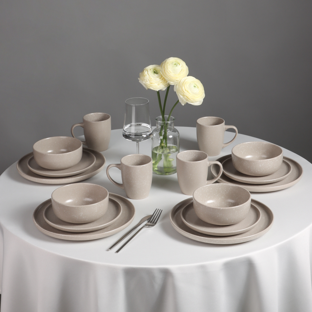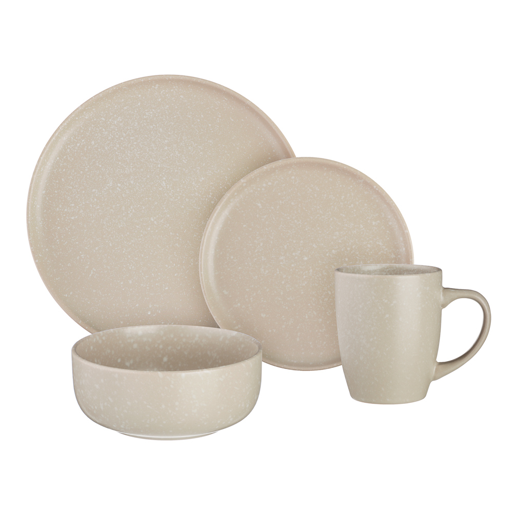 Набор столовой посуды MILLIMI из 16 предметов – это стильный сервиз на 4 персоны для сервировки повседневного и праздничного стола. В состав набора входят: 4 тарелки диаметром 26 см, 4 тарелки диаметром 20 см, 4 глубоких салатника диаметром 14 см и 4 кружки объемом 340 мл. Все предметы изготовлены из высококачественной керамики повышенной прочности, устойчивой к образованию царапин от столовых приборов. Посуда в благородном бежевом цвете смотрится современно и гармонично сочетается с любыми столовыми приборами и текстильными элементами оформления стола: салфетками, скатертями, декоративными подставками. Легко комбинируются с другой посудой. Может стать отличным подарком по случаю новоселья, годовщины, юбилея или свадьбы.