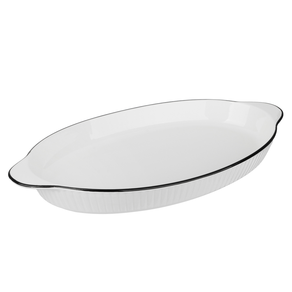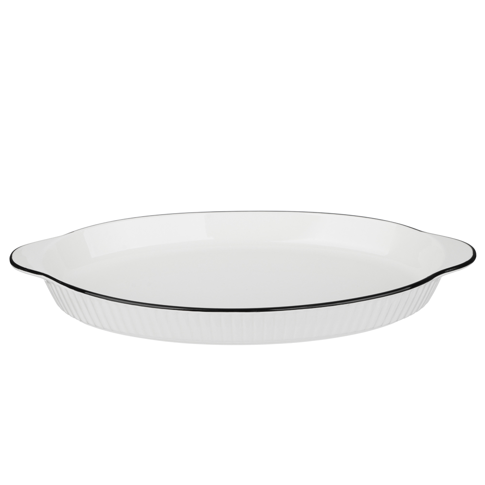 Овальная форма для запекания и сервировки MILLIMI Солообъемом 700 мл и размером 37,5х19,5х4 см из фарфора – это посуда для приготовления блюд в духовке, а также для эффектной подачи готовых блюд непосредственно из духовки на общий стол. Новая серия посуды Соло выполнена из белой керамики с черной отводкой, имеет рельефный узор, смотрится эстетично и лаконично. Фарфор имеет превосходную термостойкость, равномерно нагревается, а гладкая поверхность предотвращает пригорание. Белая форма подчеркивает красоту блюд, благородно смотрится на столе и прекрасно сочетается с любой посудой и другими элементами сервировки. Легко моется, не образует нагара, не трескается при аккуратном использовании и не тускнеет.
