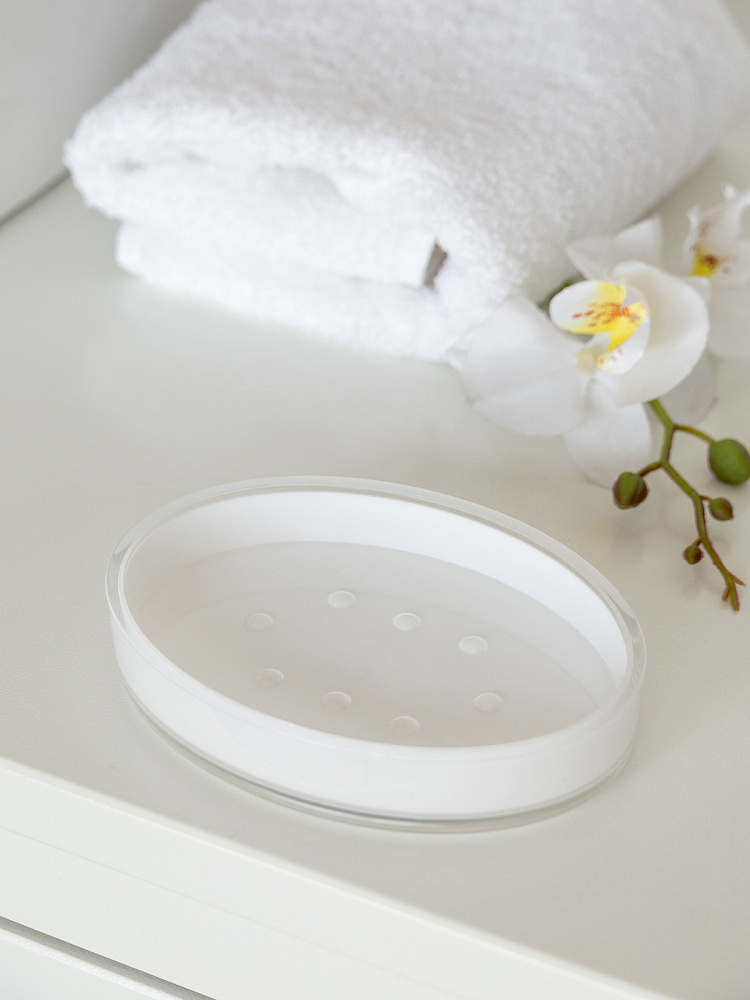 Мыльница DeNASTIA пластик овал, белый. Мыльница - это необходимая вещь в ванной комнате для всех, кто ценит настоящий комфорт, порядок и красоту. Если Вы отдаете предпочтение кусковому мылу, а не жидкому, то данная модель идеальный вариант для Вас. Любая мелочь при оформлении интерьера ванной комнаты может добавить изюминку и уют. Мыльница впишется практически в любой современный интерьер. Мыльницу можно приобрести вместе с другими аксессуарами для ванной комнаты, собрав единый по цвету и стилю комплект (стакан для зубных щёток, диспенсер для жидкого мыла, ершик для туалетной комнаты с чашей). Размеры изделия: длина - 13,3 см, ширина - 9,8 см, высота - 2,6 см.