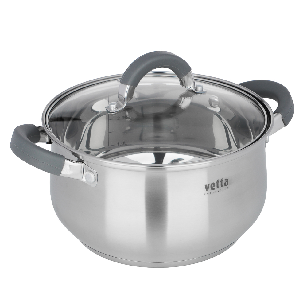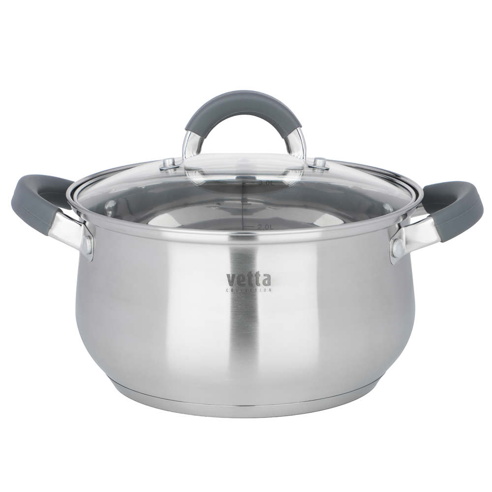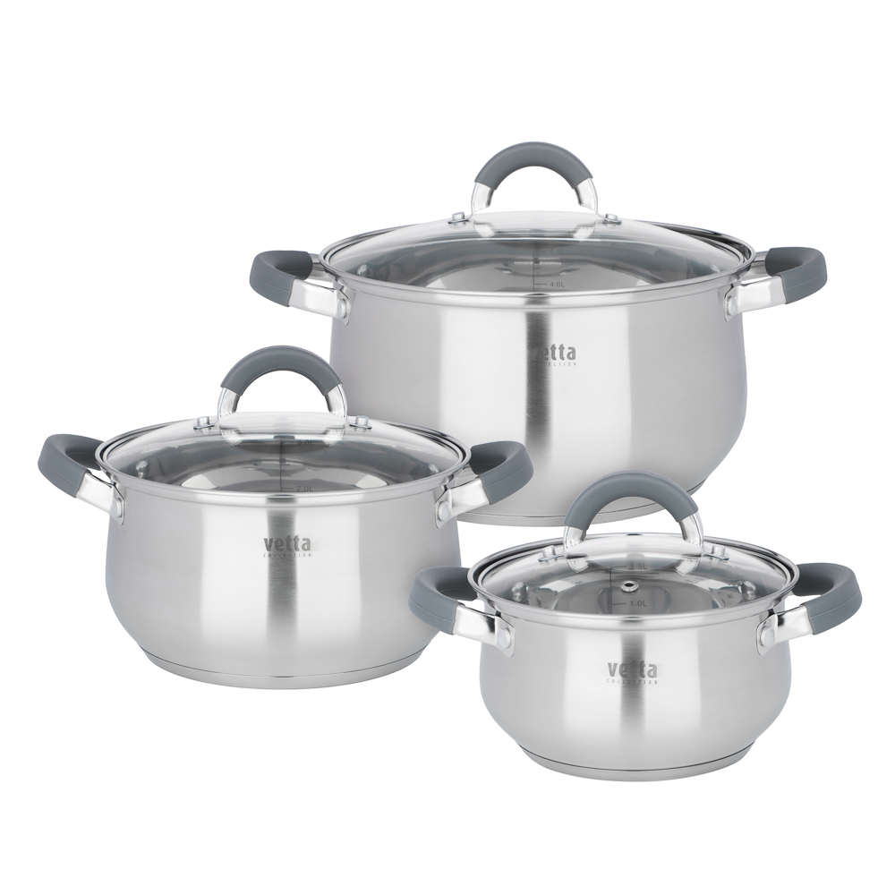 Набор кастрюль VETTA «Вена» из 6 предметов создан специально для тех, кто ценит безупречное качество, инновационные решения и стильный дизайн. Включает 3 кастрюли с крышками с отверстиями для выпуска пара разного объема 1,9, 3,6 и 6 л для приготовления самых разных блюд: от утренних каш до сложных гастрономических шедевров. Посуда изготовлена из высококачественной нержавеющей стали AISI 201, которая сочетает в себе коррозионную стойкость, прочность и элегантный блеск, сохраняющийся на долгие годы. Пятислойное капсульное дно обеспечивает равномерное термораспределение, поэтому блюда не подгорают и получаются максимально полезными, вкусными и ароматными. Эргономичные ручки с термостойкими силиконовыми накладками не нагреваются во время готовки, обеспечивая надежный и безопасный хват. А благодаря удобной мерной шкале литража вы всегда сможете точно контролировать объем ингредиентов. Посуда легко моется как вручную, так и в посудомоечной машине. Подходит для всех типов плит.