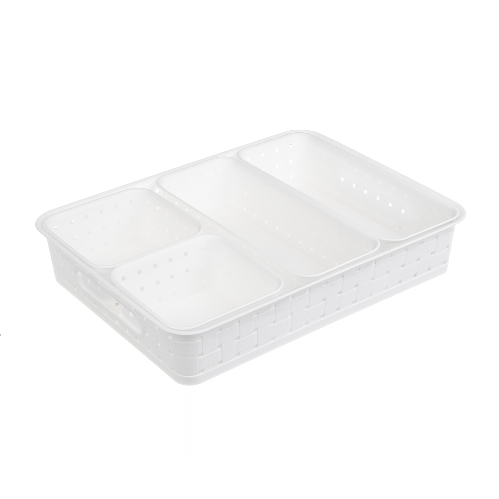 Функциональный набор из 5 пластиковых лотков VETTA поможет легко организовать хранение мелких предметов. В комплект входят: 1 большой прямоугольный контейнер, 2 квадратных и 2 прямоугольных лотка. Белый цвет и лаконичный дизайн подойдут для любого интерьера. Изготовлены из прочного пластика, устойчивого к повреждениям и легко очищающегося. Идеальны для хранения канцелярии, косметики, аксессуаров или кухонных принадлежностей.