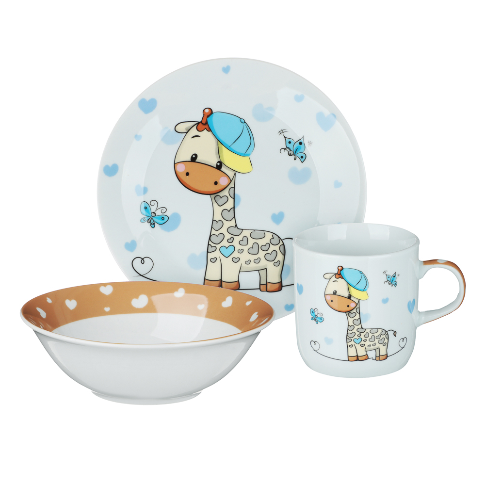 Набор посуды из 3-х предметов (плоская тарелка, глубокая тарелка, кружка), тм MILLIMI «Жираф» – это красочный детский набор для ежедневных завтраков, обедов и ужинов, который превратит каждый прием пищи в увлекательное приключение и поможет развить у ребенка здоровый аппетит. Яркий принт с милым жирафом создает позитивное настроение и вызывает интерес у малыша. Посуда изготовлена из прочного качественного фарфора, легко моется, не накапливает бактерии и запахи. Оптимальный размер и форма каждого предмета специально подобраны для детских ручек, помогая развивать самостоятельность за столом.