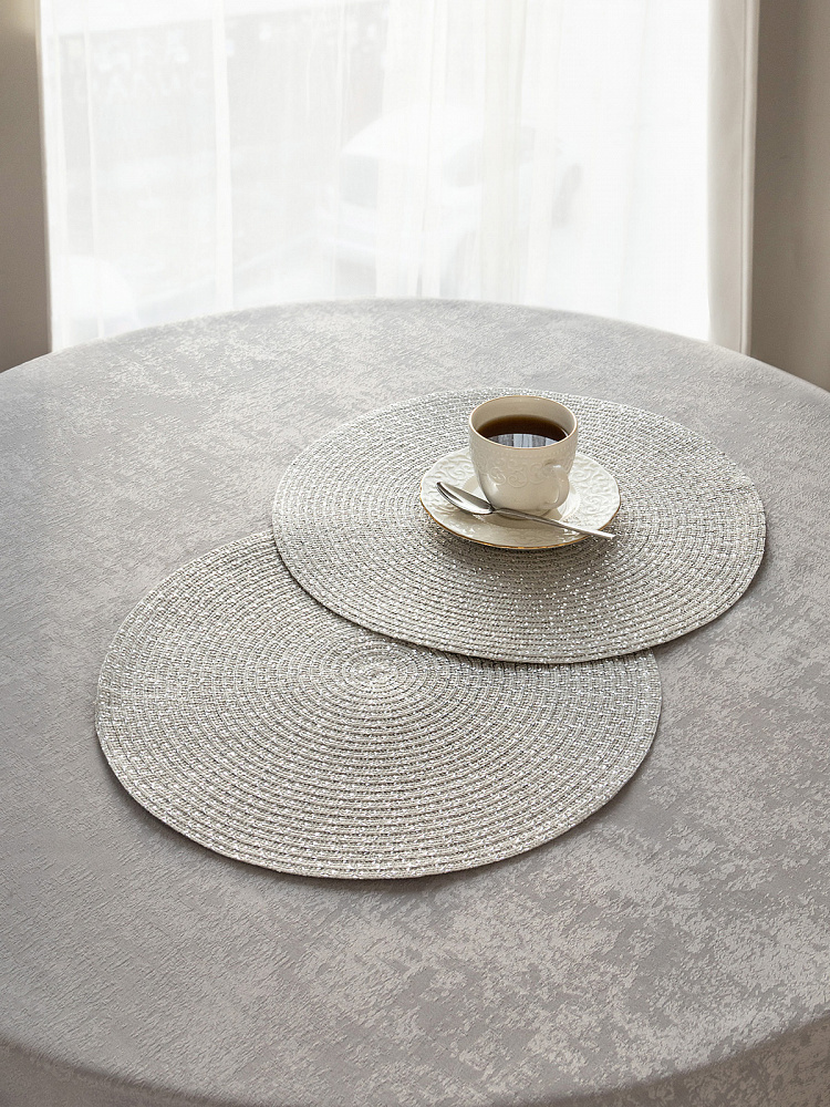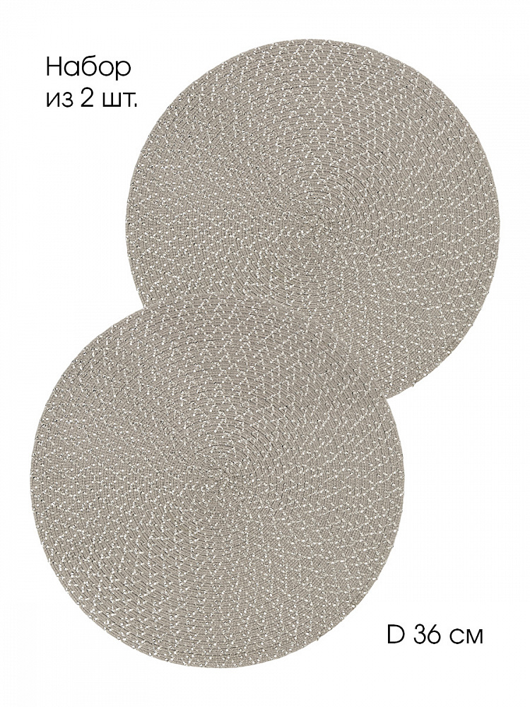 Набор салфеток сервировочных круглых плетеных с люрексом поможет создать красивую атмосферу за обеденным столом, будет препятствовать загрязнению и изнашиванию столешницы. Плейсматы кухонные многоразовые, легко моются, салфетки термостойкие, служат как подставка под горячее. Запрещается использовать плейсматы в качестве подставок под горячие сковороды и кастрюли с плиты. Салфетки выполнены в виде плетения, могут пропускать жидкость. Салфетки продаются в наборах из 2-х штук. Рекомендуется мыть вручную под проточной водой с использованием нейтральных моющих средств, во избежание деформации не тереть, не выжимать, высушить на ровной поверхности. Диаметр 36 см, цвет серебро.