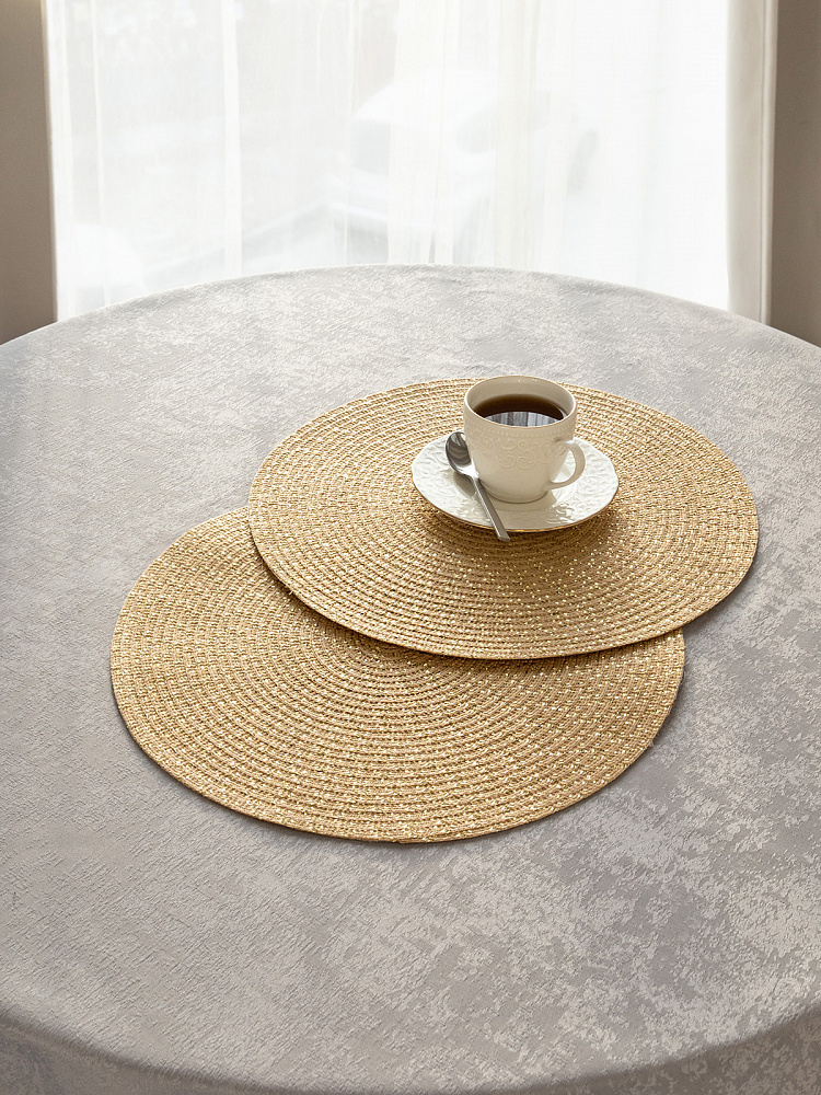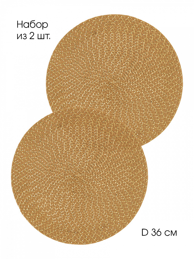 Набор салфеток сервировочных круглых плетеных с люрексом поможет создать красивую атмосферу за обеденным столом, будет препятствовать загрязнению и изнашиванию столешницы. Плейсматы кухонные многоразовые, легко моются, салфетки термостойкие, служат как подставка под горячее. Запрещается использовать плейсматы в качестве подставок под горячие сковороды и кастрюли с плиты. Салфетки выполнены в виде плетения, могут пропускать жидкость. Салфетки продаются в наборах из 2-х штук. Рекомендуется мыть вручную под проточной водой с использованием нейтральных моющих средств, во избежание деформации не тереть, не выжимать, высушить на ровной поверхности. Диаметр 36 см, цвет золото.
