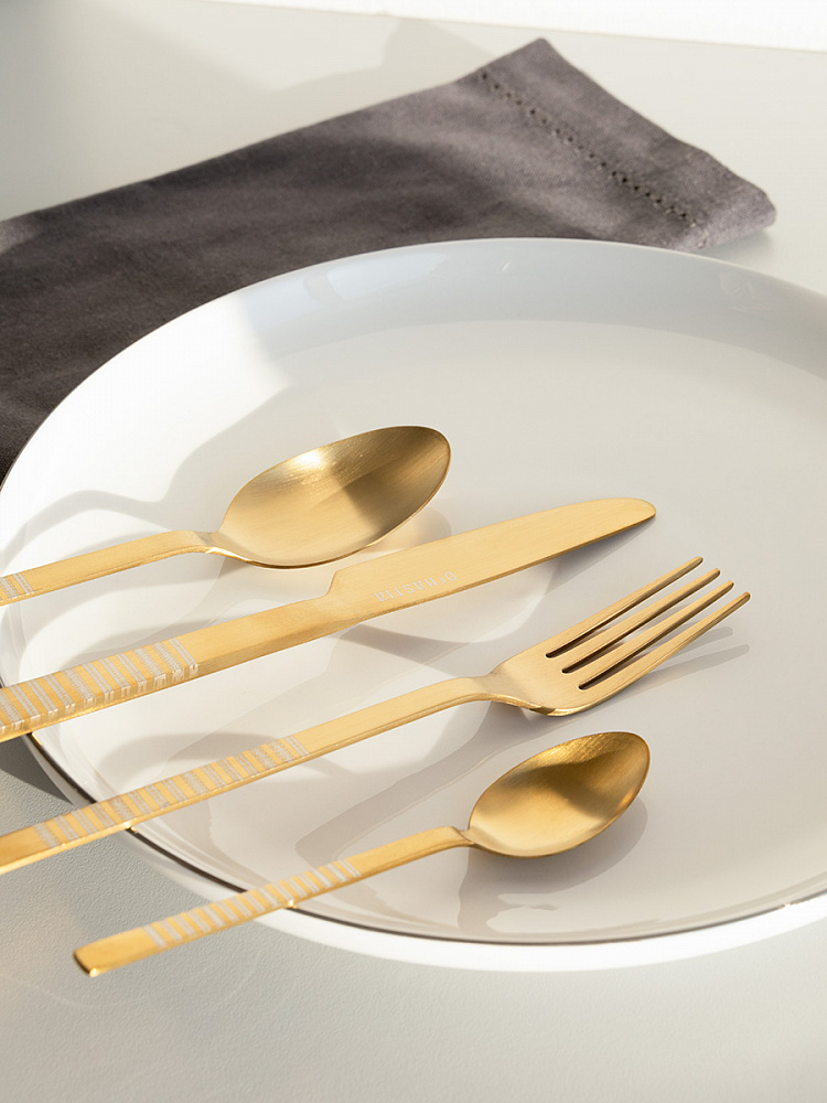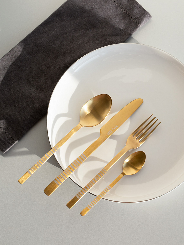 Набор столовых приборов Орион 4 предм (чайная, столовая ложка, вилка, нож) лазер, нерж., цвет золотистый. Набор столовых приборов с оригинальным дизайном из нержавеющей стали прекрасно подходит как для ежедневного использования, так и для праздничного стола. Набор состоит из 4х предметов и включает в себя столовую ложку, столовую вилку, столовый нож, чайную ложку, обеспечивая полный набор приборов для ежедневного использования. Приборы изготовлены из высококачественной нержавеющей стали, которая обеспечивает долгий срок службы и устойчивость к коррозии. Очарование набора заключается в его современном и элегантном дизайне, который подходит для любого интерьера и сервировки. Каждый столовый предмет имеет удобную рукоять, обеспечивая комфортное и уверенное использование. Столовые приборы разрешено мыть в посудомоечной машине. Для столовых ножей рекомендована ручная мойка.