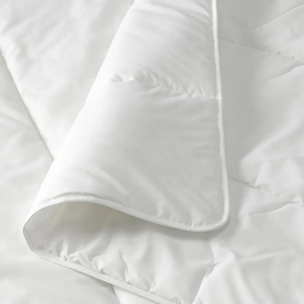 Теплое и простое в уходе одеяло из смесовой ткани из полиэстера и хлопка с наполнителем из мягкого полого полиэстерного волокна на основе переработанного сырья.