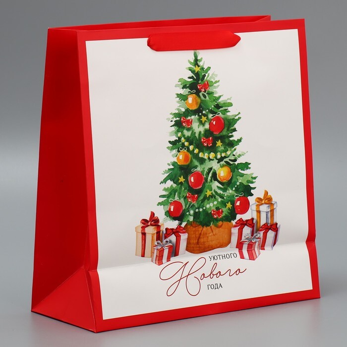 Пакет подарочный новогодний ламинированный квадратный Happiness, 30×30×12 см