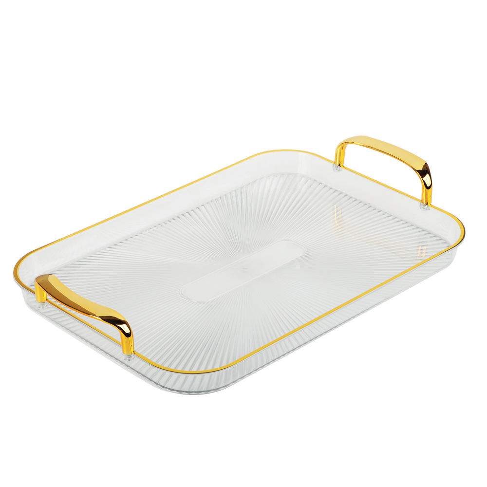 Поднос прямоугольный с ручками с золотой каемкой 42,5x27x3 см – это элегантный круглый поднос с удобными позолоченными ручками и декоративной золотой окантовкой, который станет изысканным украшением праздничной сервировки. Может использоваться для разноса блюд и уборки грязной посуды, а также его можно использовать для сервировки напитков, фруктов, закусок или десертов. Прозрачный пластик ПЭТ легкий и в то же время прочный и практичный. Легко моется. Подходит для домашнего застолья, для кафе и оформления фуршетов. Отличный выбор для тех, кто ценит эстетику и функциональность.