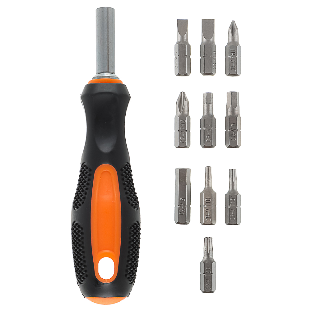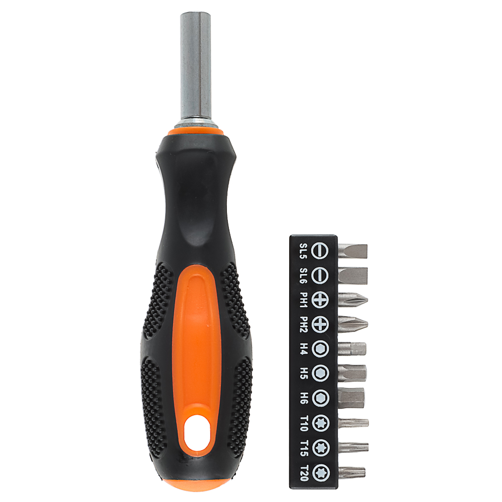 РОКОТ — это универсальная отвёртка с магнитным наконечником и набором из 10 бит, которые подходят для различных типов крепежа. Благодаря магнитному наконечнику, биты надёжно удерживаются на отвёртке, что облегчает процесс работы и ускоряет процесс замены насадок. Эргономичная ручка обеспечивает комфортное использование инструмента, снижая усталость руки во время работы.