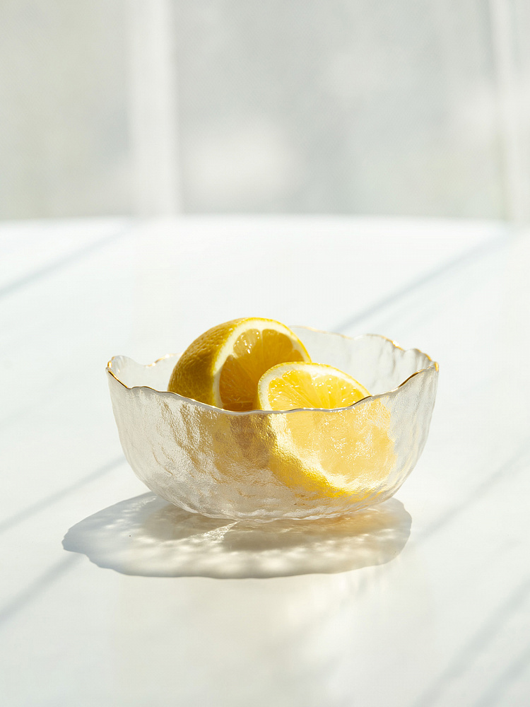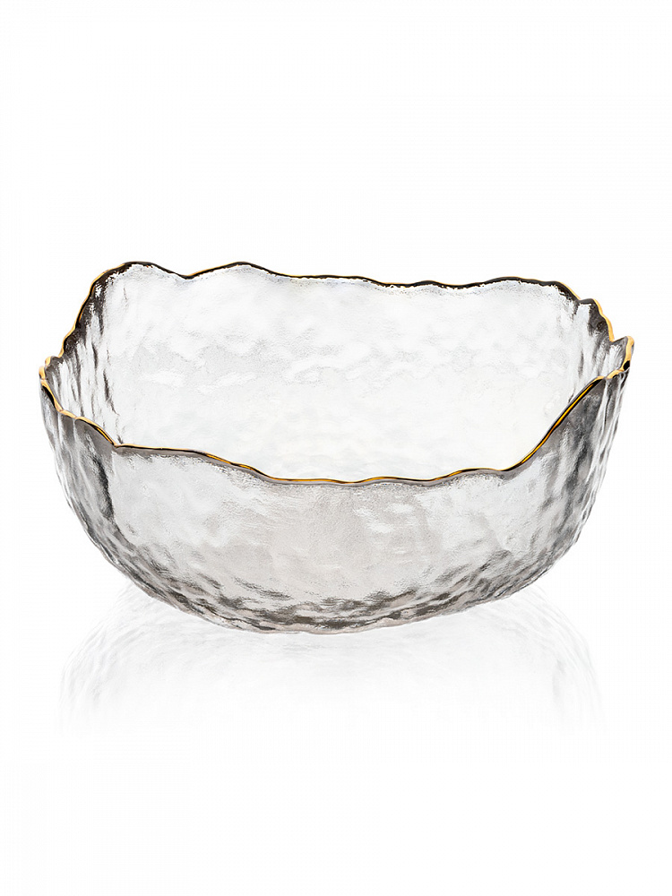 Салатник (маленький) LUCKY, цвет прозрачный с золотой каймой. Салатник с оригинальным дизайном прекрасно впишется в интерьер вашей кухни, украсит праздничный стол и создаст приятную атмосферу для любого мероприятия. Стеклянная салатница обладает высокой прочностью и изысканным дизайном, что делает ее не только практичной, но и красивой. Дизайн прозрачной посуды повторяет эффект мятого стекла, а золотая окантовка добавляет изысканности. Оригинальный дизайн не оставит равнодушными Ваших гостей. Используйте салатник для сервировки праздничного и торжественного стола. Глубокую тарелку можно использовать для украшения интерьера - положить в нее фрукты, конфеты или сладости. Декоративная тарелка станет украшением вашей кухни, столовой или гостиной. Размер салатника D13. В нашей коллекции Вы так же найдёте салатники других размеров: D20, D17. Рекомендована мойка вручную, с использованием мягких моющих средств. Объём салатника 350 мл.
