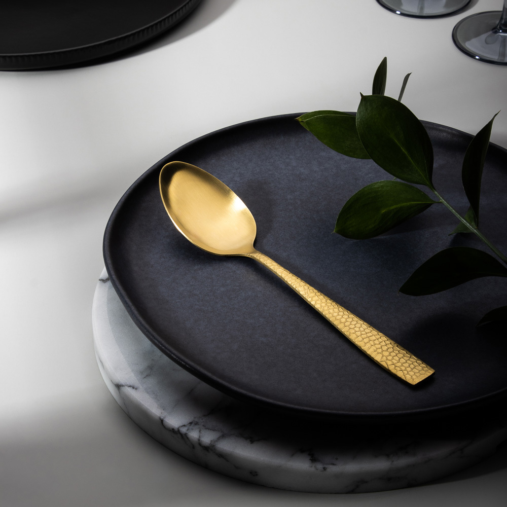 Ложка столовая SATOSHI «Феличе» – оригинальное решение для домашней и ресторанной сервировки. Коллекция «Феличе» – это дизайнерские столовые приборы, которые сочетают в себе эксклюзивность и универсальность, поэтому они будут одинаково выигрышно и уместно смотреться как в винтажной, так и в современной сервировке. Золотой цвет приборов в дуэте с белоснежной посудой и скатертью – воплощение безупречного вкуса. Такой вариант сервировки подходит для особо торжественных случаев. Столовые приборы золотого цвета также идеально сочетаются с цветными аксессуарами и посудой.