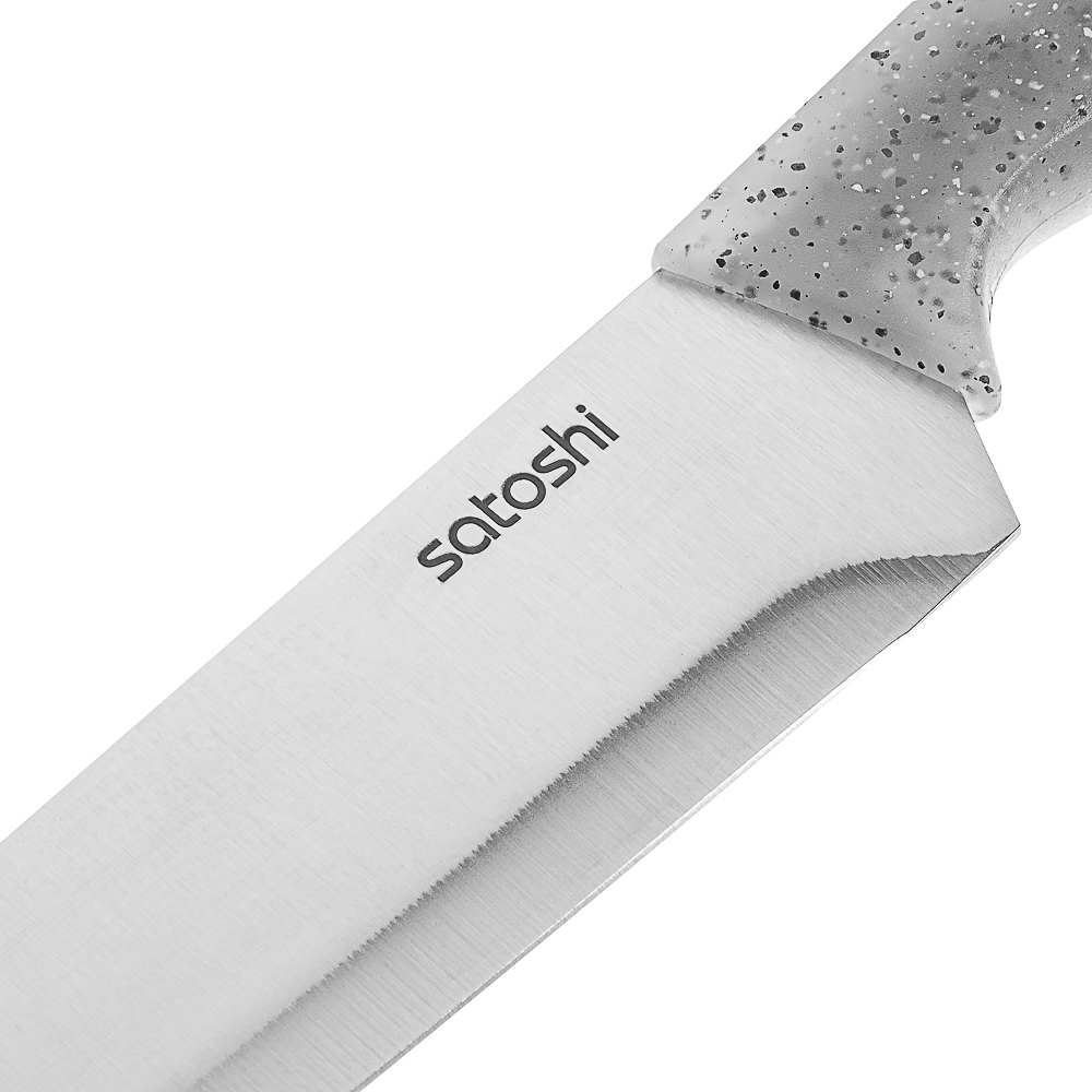 Универсальный кухонный нож SATOSHI «Ивуа» с длиной лезвия 17,8 см предназначен для нарезки любых продуктов: овощей, фруктов, деликатесов, а также для разделки мяса и рыбы. Нож имеет продуманную геометрию, тонкий угол заточки и эргономичную рукоять, которая комфортно ложится в руку и не вызывает усталости кисти даже при длительной нарезке продуктов. Качественная нержавеющая сталь не боится коррозии, не деформируется и долго держит заточку. Лаконичный дизайн впишется в интерьер любой кухни.