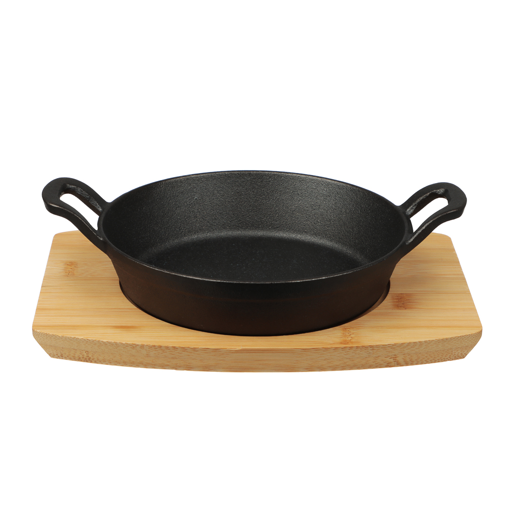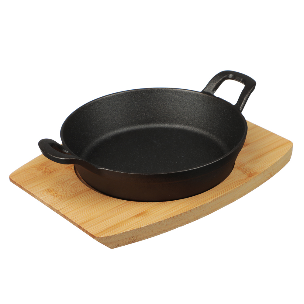 Чугунная сковорода мини на подставке из бамбука SATOSHI, круглая, 18 см, с ручками – это посуда для порционного приготовления и эффектной подачи блюд. Удобна для порционных омлетов, запекания овощей, мини-стейков и вторых блюд. Изготовлена из качественного чугуна. Утолщенное дно обеспечивает улучшенное термораспределение, поэтому блюда получаются равномерно приготовленными, ароматными и сочными. Долго сохраняет тепло, поэтому готовое блюдо медленно остывает. Стильная бамбуковая подставка защищает поверхность стола и скатерть от воздействия высоких температур, а также добавляет эстетики в сервировку. Сковорода легко моется, не боится царапин. Подходит для всех типов плит, включая индукцию. Отличный выбор для домашней кухни, кафе и ресторана.
