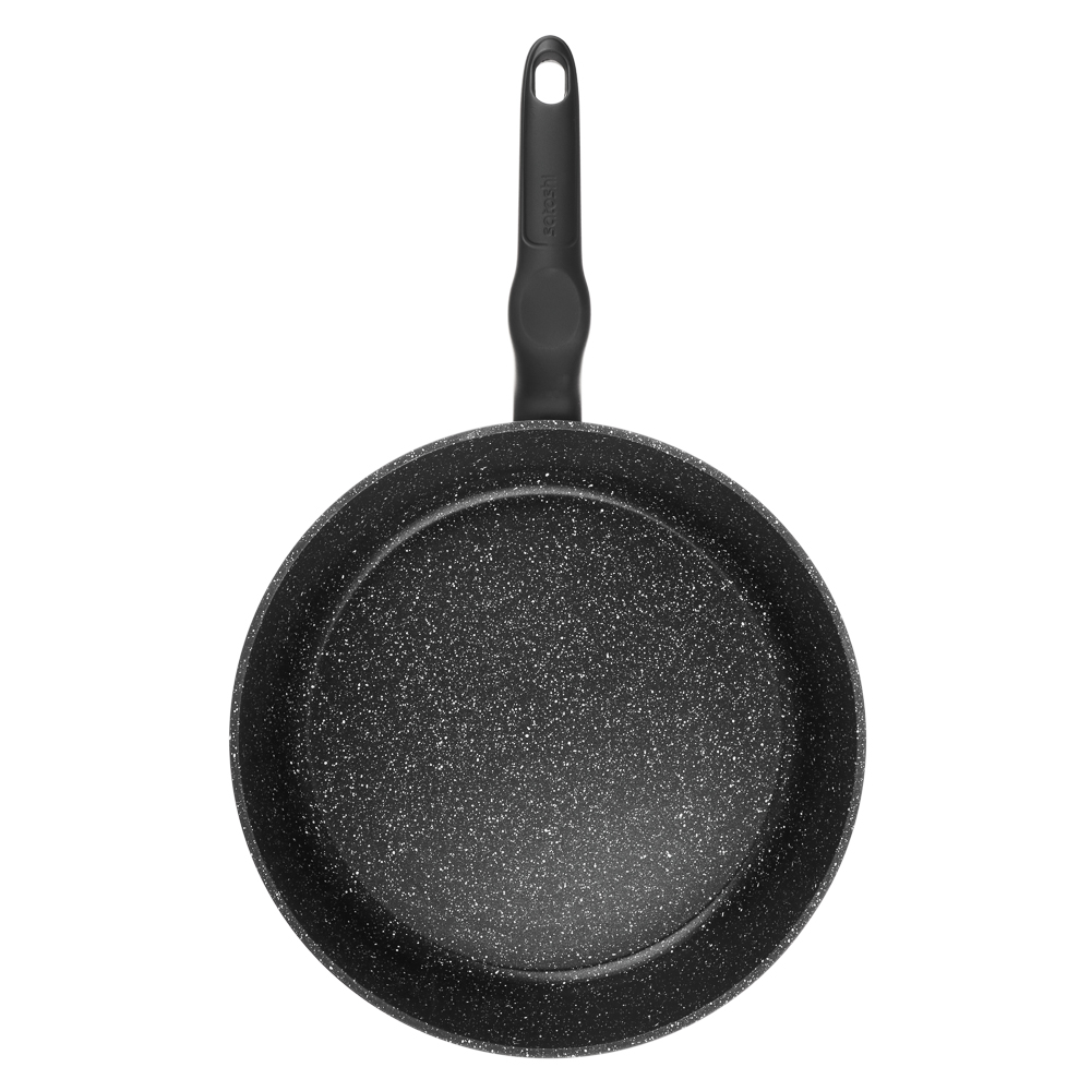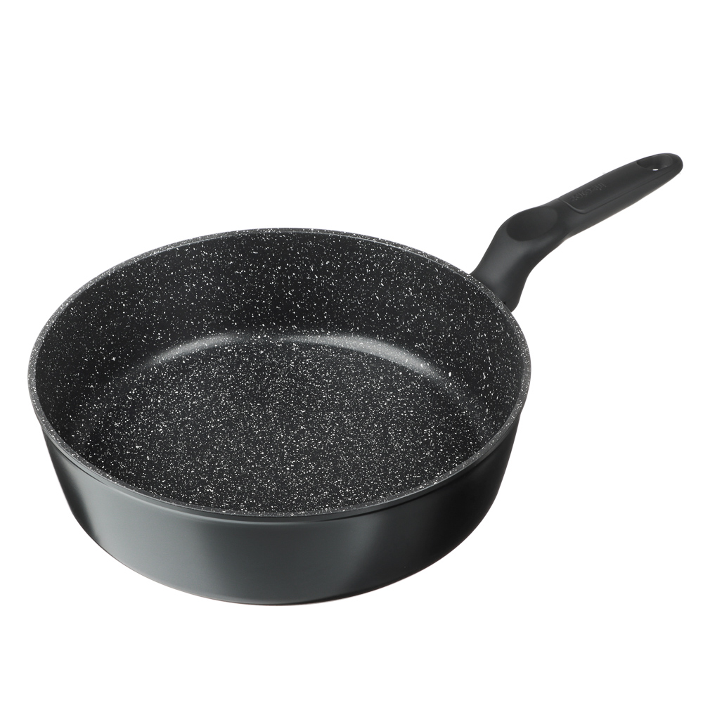 Вы спросите - какая сковорода лучше? Конечно же любимая! Глубокая сковорода SATOSHI Стоун диаметром 28 см станет вашей любимой посудой. Стойкое антипригарное покрытие под мрамор не позволяет пище пригорать, а литой алюминий обеспечивает равномерное приготовление блюд. Благодаря высоким ровным стенкам сковороду можно использовать как сотейник. Глубокая сковорода SATOSHI Стоун подходит для использования на всех видах плит, в том числе и на индукции. Такую посуду можно мыть в посудомоечной машине, а благодаря петле на ручке хранить вертикальном положении. Ручки сковород серии Стоун имеют эргономичную изогнутую форму с углублением под большой палец и выполнены из бакелита с силиконовым напылением, поэтому сковорода не выскользнет из рук во время готовки.