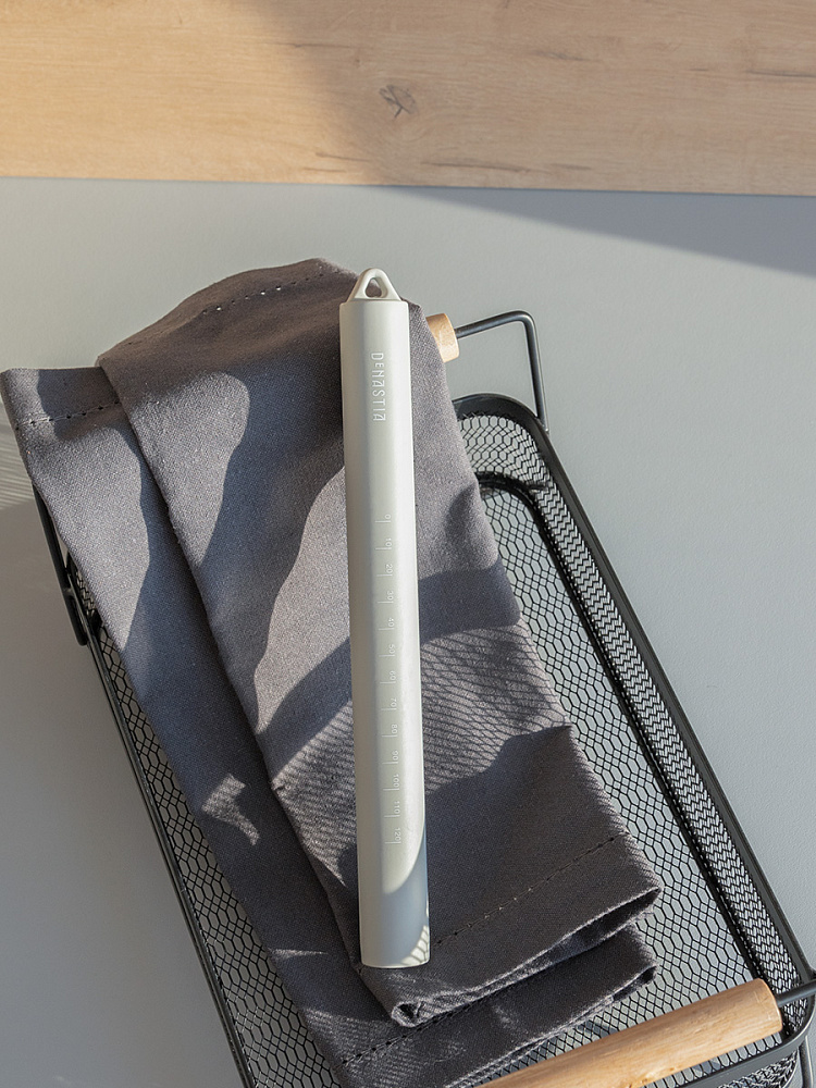 Скалка DeNASTIA 26,5x2,5 см, силикон, цвет серый. Скалка силиконовая для раскатывания теста незаменимый помощник для готовки пиццы, пельменей, печенья и прочей выпечки. Силиконовая скалка представляет собой цельнолитой гладкий силиконовый валик. Благодаря бесшовной технологии в раскатывалку не будут забиваться частицы теста, а благодаря силиконовому покрытию скалки тесто не липнет к ней и легко раскатывается. Силиконовая скалка не впитывает запахи, не деформируется при использовании. Нанесенная разметка линейки на поверхности скалки позволяет работать с размерами раскатываемого полотна. Литая скалка очень удобный и компактный кухонный аксессуар, отсутствие ручек позволяет использовать для работы всю поверхность, а отверстие для подвеса позволит разместить скалку в удобном для вас месте. Литая скалка из силикона обладает антибактериальными свойствами, не впитывает жидкость и запахи, не накапливает бактерии, в сравнении с деревянной скалкой.