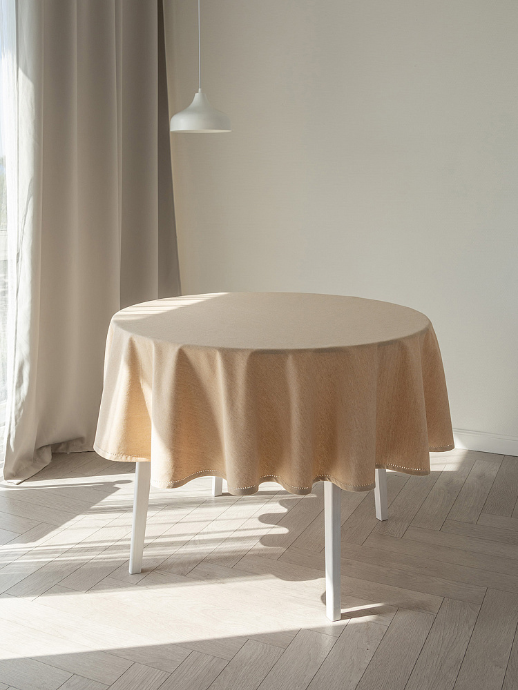 Скатерть DeNASTIA Basic linen мережка по краю D160 см, цвет бежевый. Классическая скатерть из серии BASIC COLLECTION отличное дополнение к вашему столу. Текстильная скатерть украсит праздничный стол, дополнит интерьер, защитит столешницу. Основы базовой коллекции составляют высокое качество материалов, износостойкость, универсальность и комбинаторность фактур и материалов. Скатерть из базовой коллекции сформирует основу для любого стиля и позволит удобно собрать образ для различного интерьера. Однотонная скатерть с мережкой лучшее решение для каждодневного использования. Пусть каждый завтрак, обед или ужин станет особенным благодаря этому аксессуару, добавьте классический стиль и элегантность в вашу кухню. Скатерть из хлопка и полиэстера — это прекрасный предмет интерьера, отличается высокой прочностью и долговечностью. Хлопок и полиэстер не выгорает на солнце и не выцветает при стирке. Скатерть для обеденного стола сохраняет первоначальный вид и цвет длительное время.