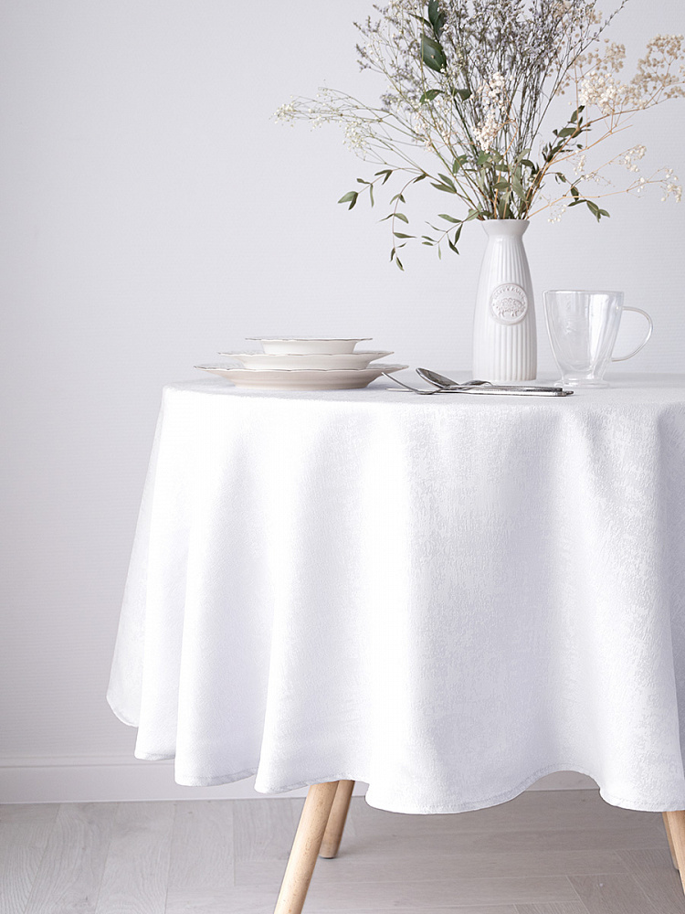 Скатерть DeNASTIA D180 см, Жаккард, цвет белый (эффект потёртости). Скатерть "Жаккард" отличное дополнение к вашему столу. Текстильная скатерть в современном стиле украсит праздничный стол, дополнит интерьер, защитит столешницу. Однотонная скатерть с фактурой потертости, имитации штукатурки и камня лучшее решение для каждодневного использования. Пусть каждый завтрак, обед или ужин станет особенным благодаря скатерти в стиле Loft. Скатерть из полиэстера — это прекрасный предмет интерьера, отличается высокой прочностью и долговечностью, замечательно впишется в интерьер в скандинавском стиле. Полиэстер не выгорает на солнце и не выцветает при стирке. Скатерть для обеденного стола сохраняет первоначальный вид и цвет длительное время. Скатерть для праздничного стола проста в уходе, достаточно постирать при 30 градусах с применением нейтрального моющего средства. Сохранит цвет и форму даже при многократных стирках.