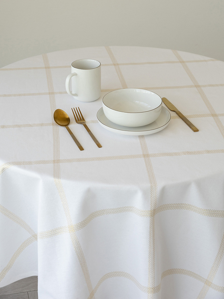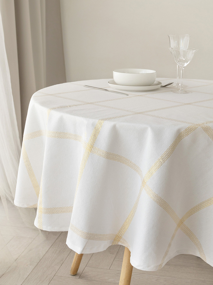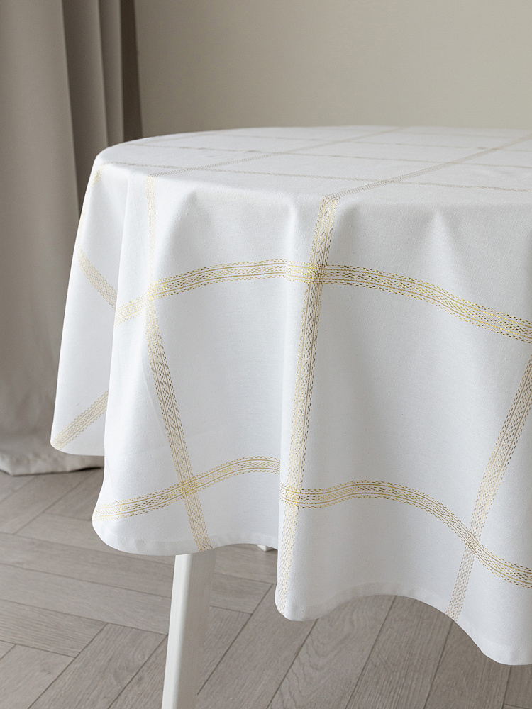 Скатерть DeNASTIA Клетка Holiday D160 см, цвет белый/золото. Текстильная скатерть отличное дополнение к вашему столу. Текстильная скатерть в современном стиле украсит праздничный стол, дополнит интерьер, защитит столешницу. Однотонная скатерть с льняной фактурой лучшее решение для каждодневного использования. Скатерть с натуральным рисунком неотъемлемый элемент в создании стильного, лаконичного и актуального интерьера. Традиционная скатерть великолепно сочетается как с базовыми предметами интерьера, так и с трендовыми модными деталями. Пусть каждый завтрак, обед или ужин станет особенным благодаря скатерти в классическом стиле. Скатерть из хлопка и полиэстера — это прекрасный предмет интерьера, отличается высокой прочностью и долговечностью, замечательно впишется в интерьер в скандинавском стиле. Материал скатерти в стиле сканди не выгорает на солнце и не выцветает при стирке. Скатерть для обеденного стола сохраняет первоначальный вид и цвет длительное время.