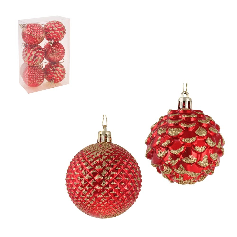 Набор шаров СНОУ БУМ диаметром 6 см красного цвета двух видов – это нарядные елочные игрушки, которые добавят красок в праздничный декор. Фактурная поверхность и украшение золотым глиттером смотрятся изящно и стильно. Шары среднего размера подходят для украшения живой и искусственной елки любого размера. Выполнены из пластика, имеют легкий вес, не боятся падения и не раскалываются. 6 штук в упаковке.