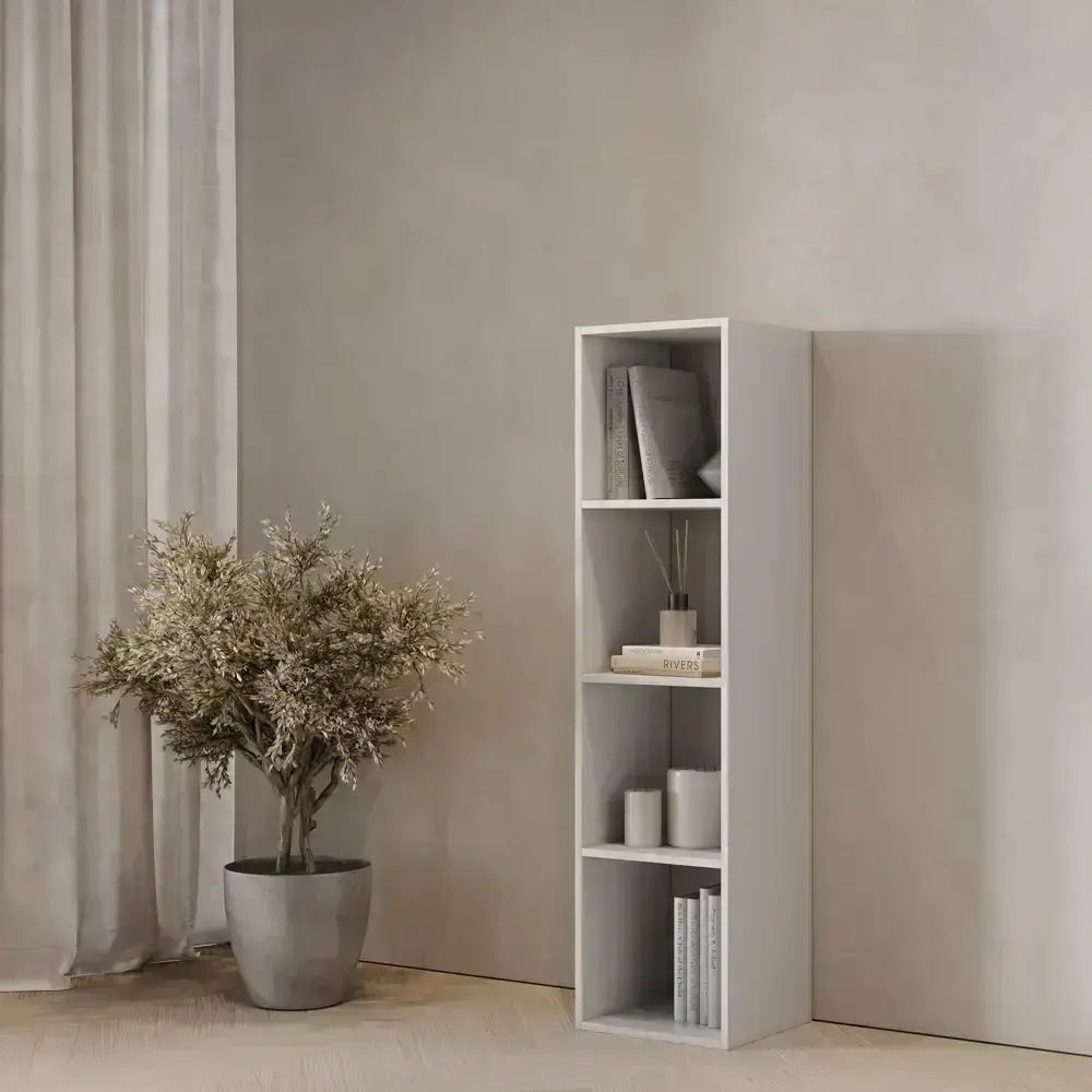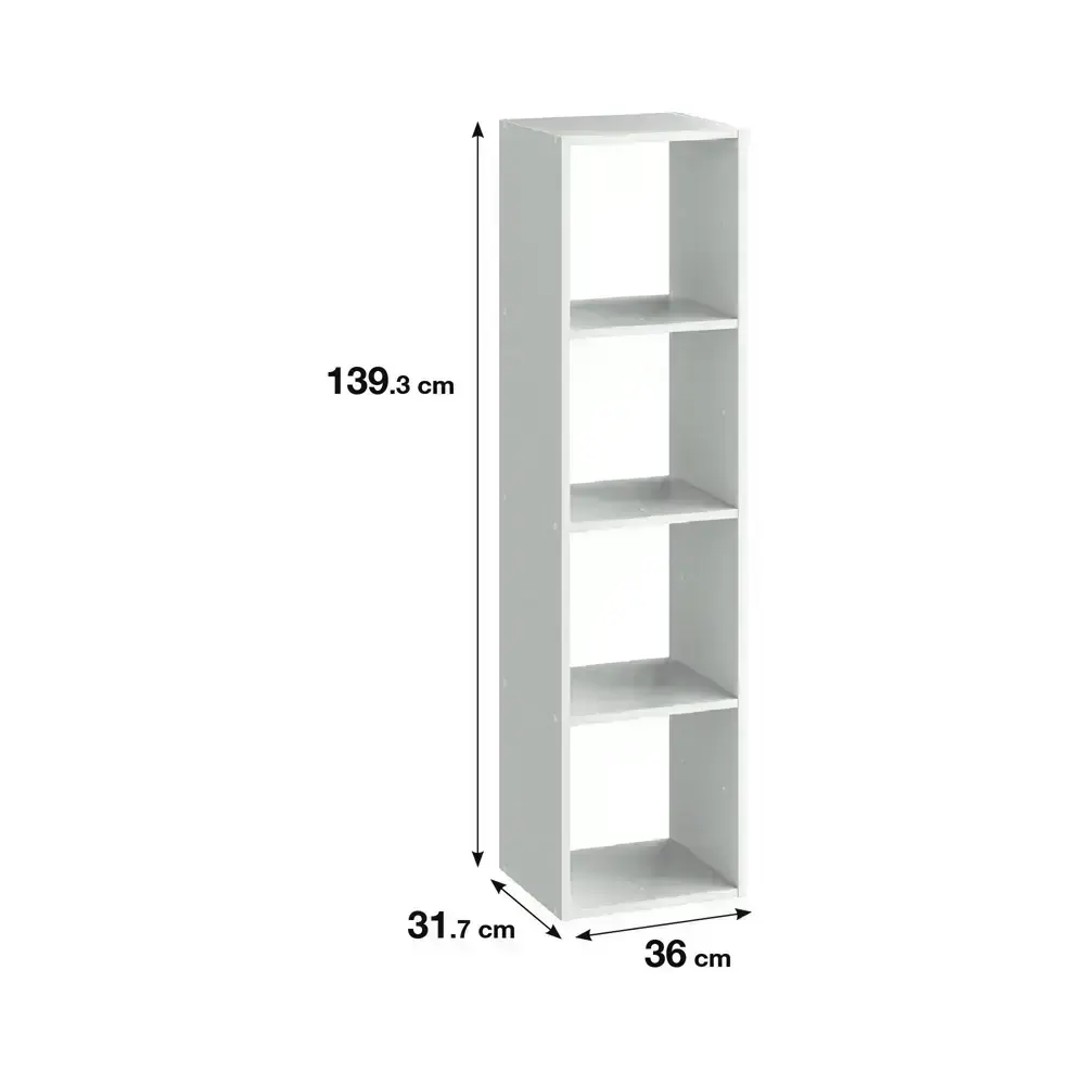 Стеллаж «Куб» на 4 секции — это основной элемент модульной системы хранения. Для максимально эффективного использования внутреннего объема может быть дополнен выдвижными ящиками, коробами, дополнительными полками, дверцами. Стеллаж изготовлен из ЛДСП толщиной 16 мм с гладким покрытием. Цвет — белый. Ширина конструкции — 36 см, высота — 139,3 см, глубина — 31,7 см. Каждая полка рассчитана на нагрузку в 5 кг. Страна производства — Россия.