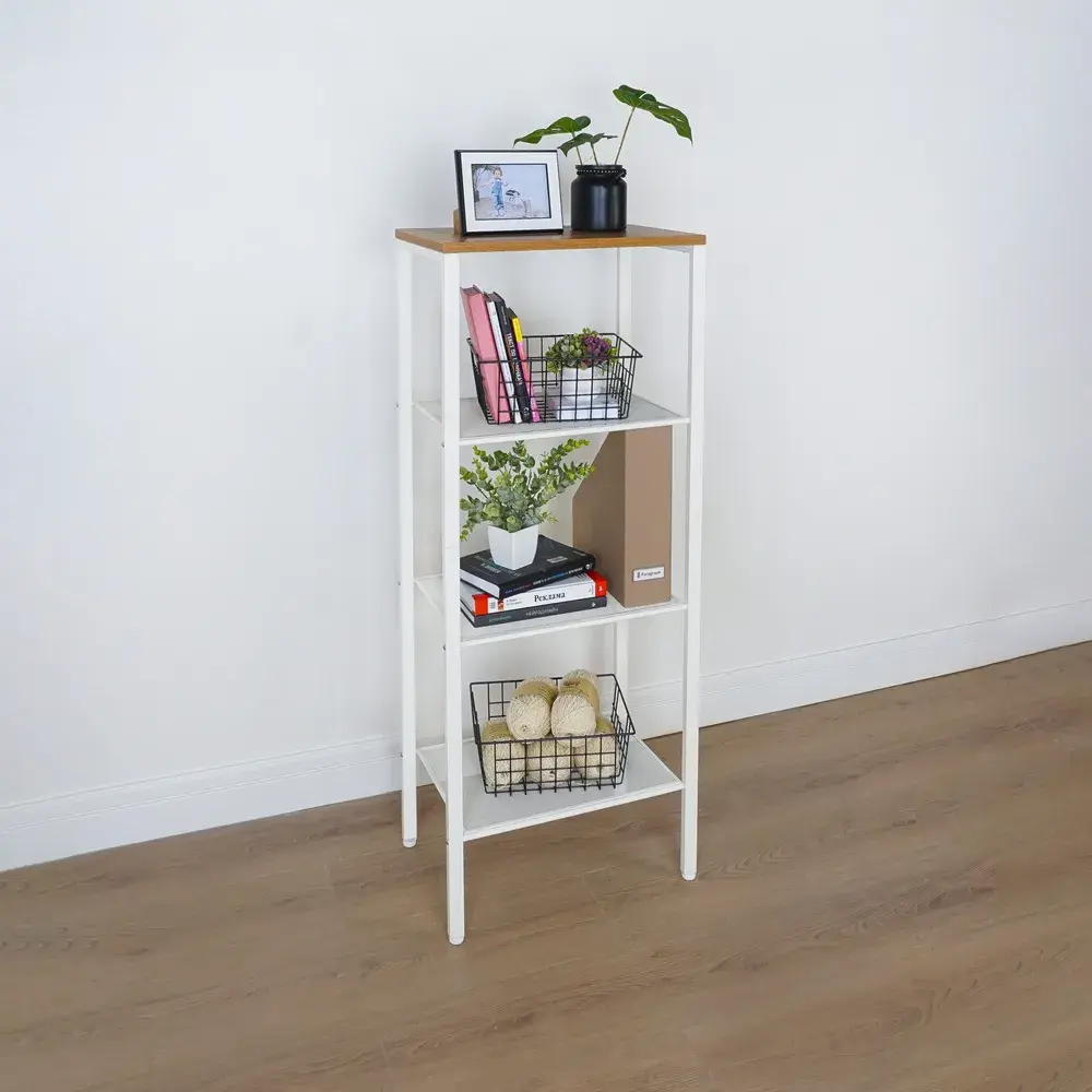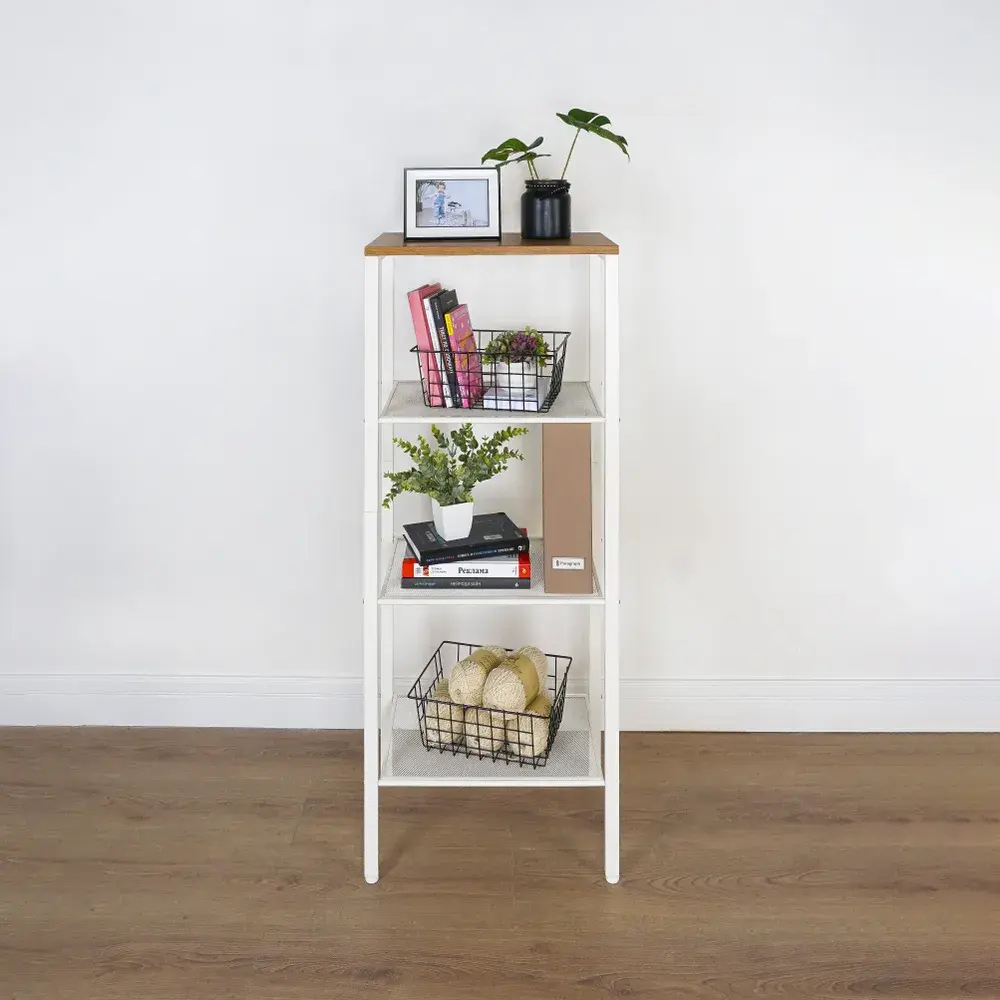 Открытый комнатный стеллаж на регулируемых ножках имеет надежные крепления.