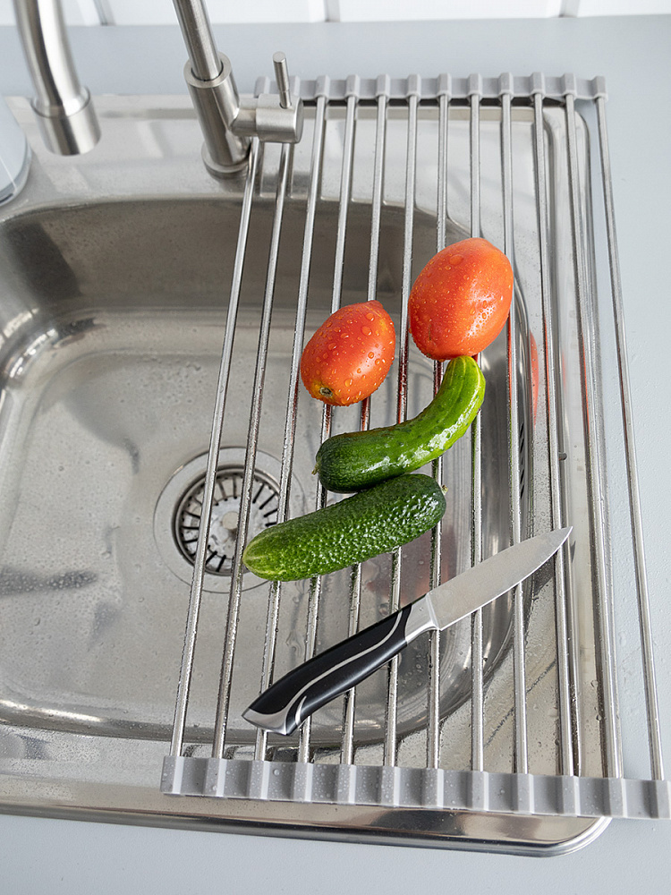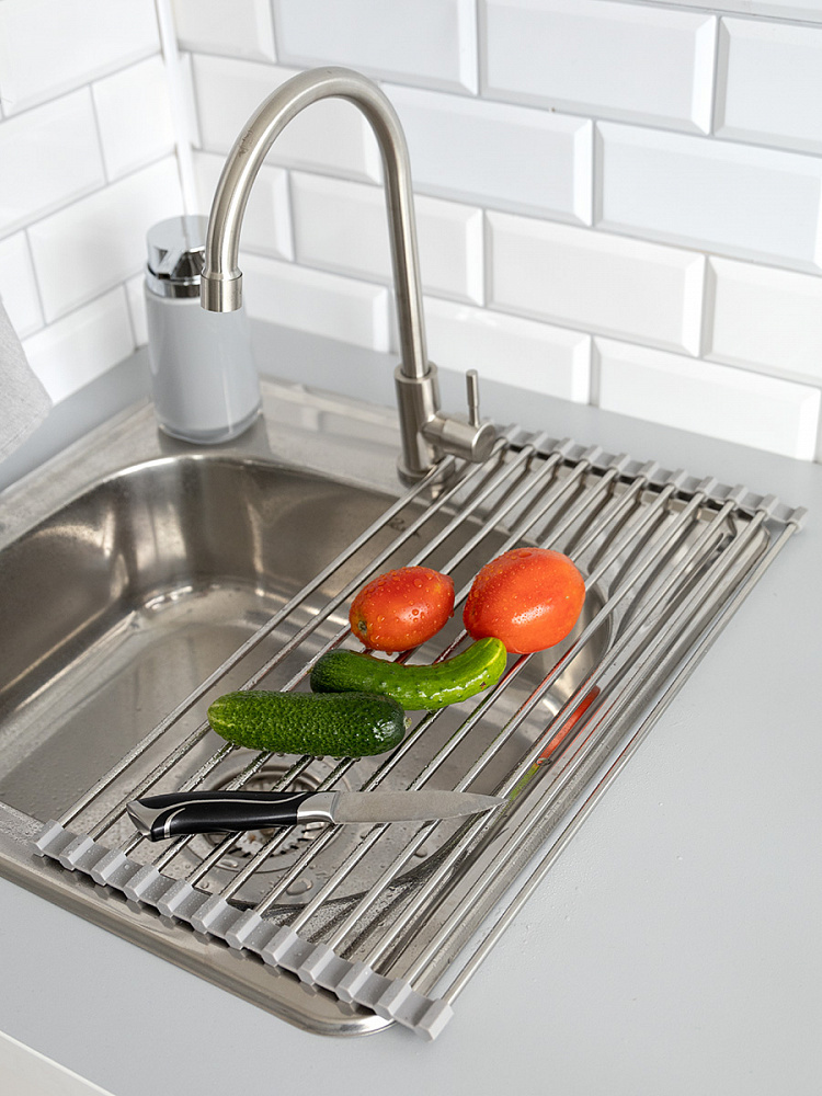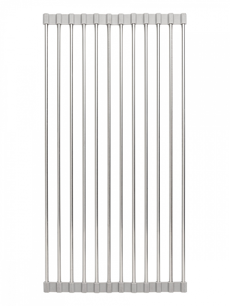 Коврик для сушки посуды на раковину из нержавеющей стали и термопластичной резины легко складывается и моется в посудомойке, устойчив к бытовой химии. Сушилка на мойку незаменима для дачи и кухни, подходит для просушивания овощей, фруктов и зелени, посуды и столовых приборов. Установив сушилку из нержавеющей стали на раковину можно использовать для разморозки продуктов, а так же под горячую посуду, кастрюли и сковороды. Складная подставка идеальна для остывания выпечки. Размеры сушилки кухонной 47х23 см.