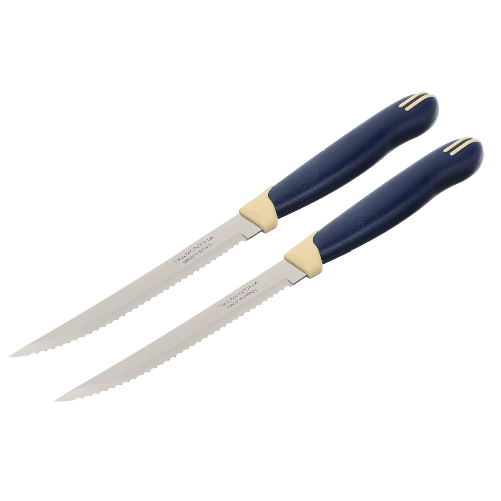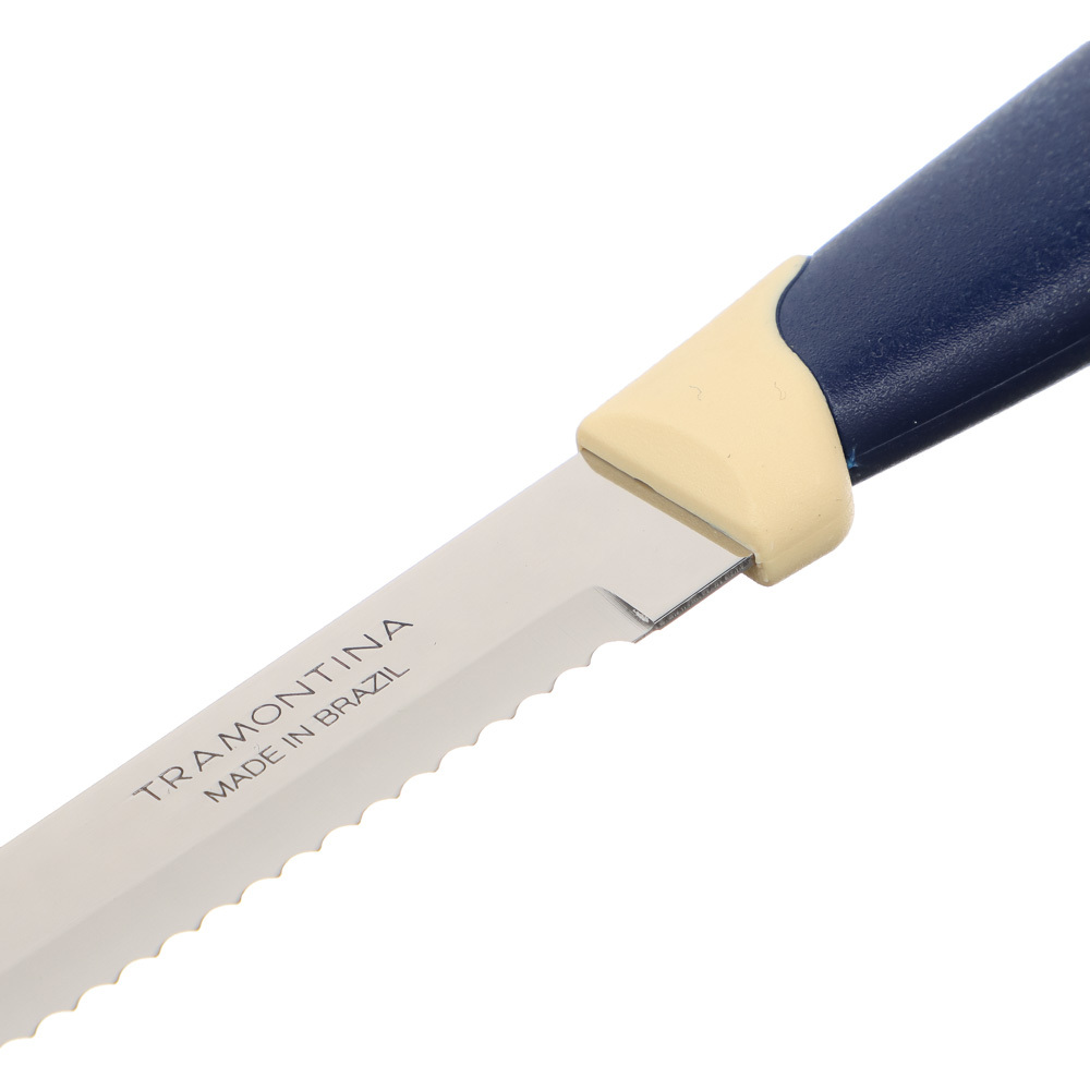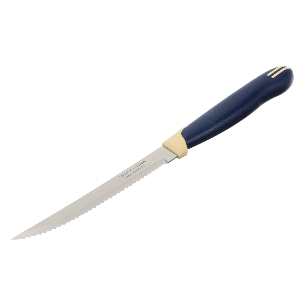 Нож для мяса TRAMONTINA MULTICOLOR 12,7 см идеально подходит для повседневного использования. Он не требует частой заточки, а кромка-пила отлично справляется с нарезкой закусок, мясных деликатесов, хлеба и овощей. Нержавеющая сталь INOX обладает высокой коррозионной стойкостью, не боится воды и кислот. Нескользящая рукоятка обеспечивает комфорт в процессе эксплуатации и не впитывает запахи пищи. 2 ножа в наборе.