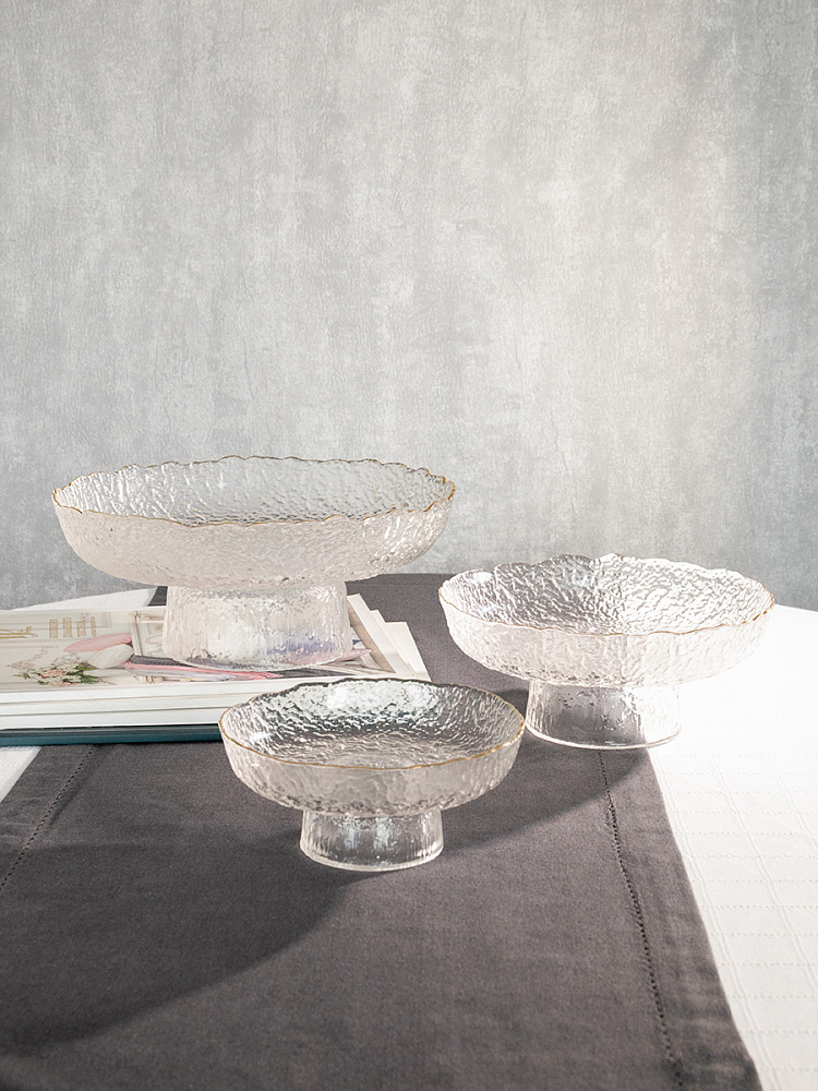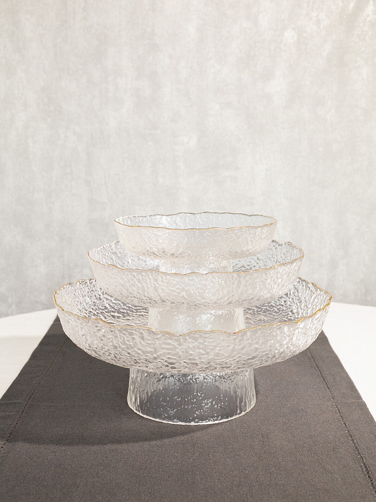 Ваза для фруктов/конфет DeNASTIA лед D27x10; 2000 мл стекло, золотая кайма, цвет прозрачный. Фруктовница ваза для конфет DeНАСТИЯ на ножке — это универсальное интерьерное решение для дома, дачи или офиса. Конфетница станет украшением вашего интерьера и добавит нотку индивидуальности в ваше пространство. Блюдо на ножке из рифленого стекла - легкий способ оживить сервировку и элегантно подать самые простые лакомства. Фруктовница имеет устойчивое основание из утолщенного стекла. Стеклянная конфетница универсальный предмет интерьера, она отлично впишется в любой интерьер столовой, гостиной или кабинета. Используйте универсальное сервировочное блюдо для конфет, орехов, сухофруктов, для подачи фруктов и овощей. Создайте стильную праздничную сервировку при помощи необычной фактурной салатницы. Для вазы из стекла рекомендована ручная мойка. Фруктовницы представлены в трех размерах: D14,5 см, 330 мл; D20,5 см, 810 мл; D27 см, 2 л.
