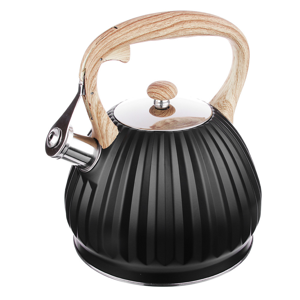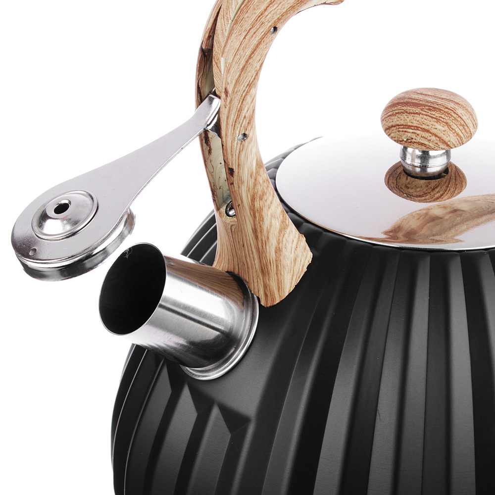 Чайник стальной VETTA "Винзен" 2,7 л сочетает в себе классическую эстетику и современную функциональность. Объём 2,7 л идеально подходит для большой семьи или приготовления горячих напитков для гостей. Чайник выполнен из высококачественной нержавеющей стали AISI 201, что обеспечивает его долговечность и устойчивость к коррозии. Специальное дно совместимо со всеми типами плит, включая индукционные. Эргономичная ручка с эффектом дерева не нагревается во время использования, обеспечивая безопасность и комфорт. Функциональный клапан свистка открывается нажатием на ручку, позволяя легко и безопасно наливать кипяток без риска ожога паром. Лаконичный чёрный цвет и стилизация под дерево добавляют изделию ретро-шарм и делают его гармоничным дополнением любой кухни.