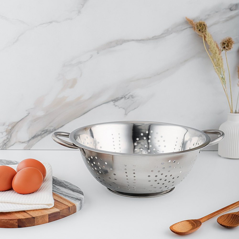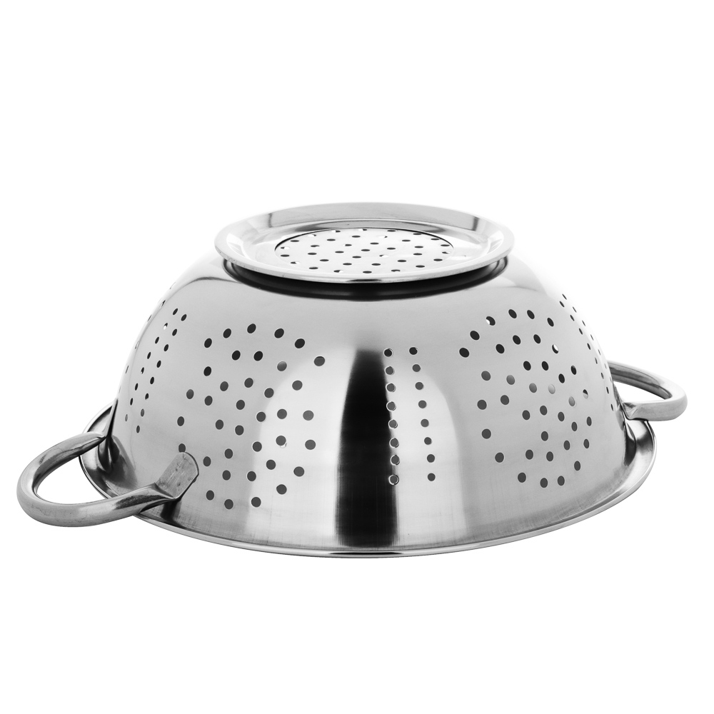 Дуршлаг на ножке из нержавеющей стали диаметром 26 см поможет слить консервированные продукты, промыть крупы и ягоды. Незаменимый помощник во время приготовления картофеля и макаронных изделий. Нержавеющая сталь не подвержена коррозии, поэтому изделие прослужит много лет. Плоское дно обеспечивает устойчивость. Две удобные ручки по бокам позволяют комфортно переносить дуршлаг, не обжигаясь и не повреждая готовые продукты.