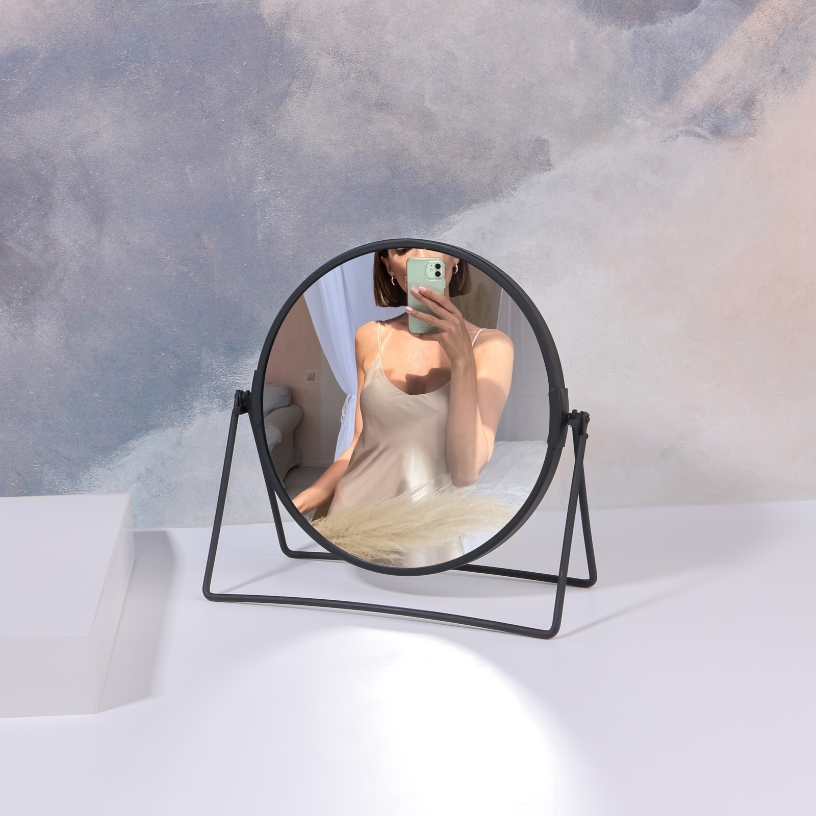 Двустороннее настольное зеркало с диаметром 16 см и чёрной металлической рамой объединяет функциональность и современный дизайн. Одна сторона отображает изображение в натуральном размере, вторая — с увеличением, что помогает детально рассмотреть черты лица или выполнить точные косметические процедуры. Поворотная конструкция обеспечивает лёгкую смену ракурса, а устойчивое основание подходит для использования в ванной, спальне или гостиной.